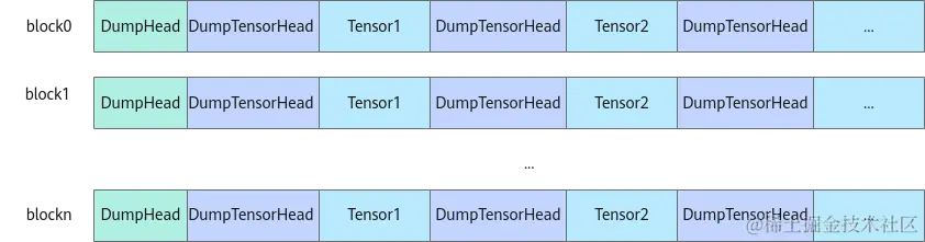 Dump时,每个block核的dump信息前会增加对应信息头DumpHead(32字节大小),用于记录核号和资源使用信息;每次Dump的Tensor数据前也会添加信息头DumpTensorHead(32字节大小),用于记录Tensor的相关信息。如下图所示,展示了多核打印场景下的打印信息结构。