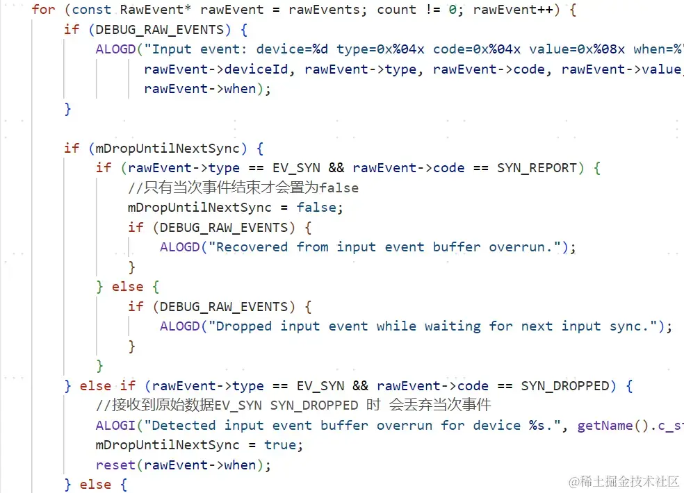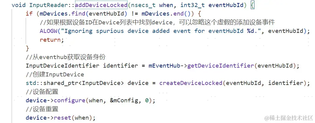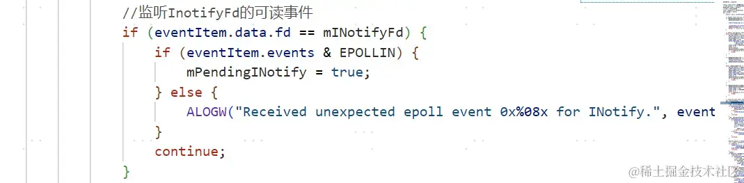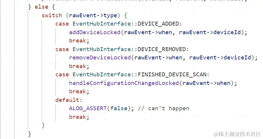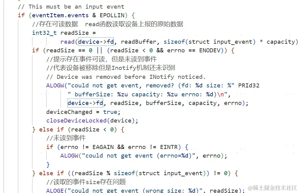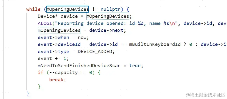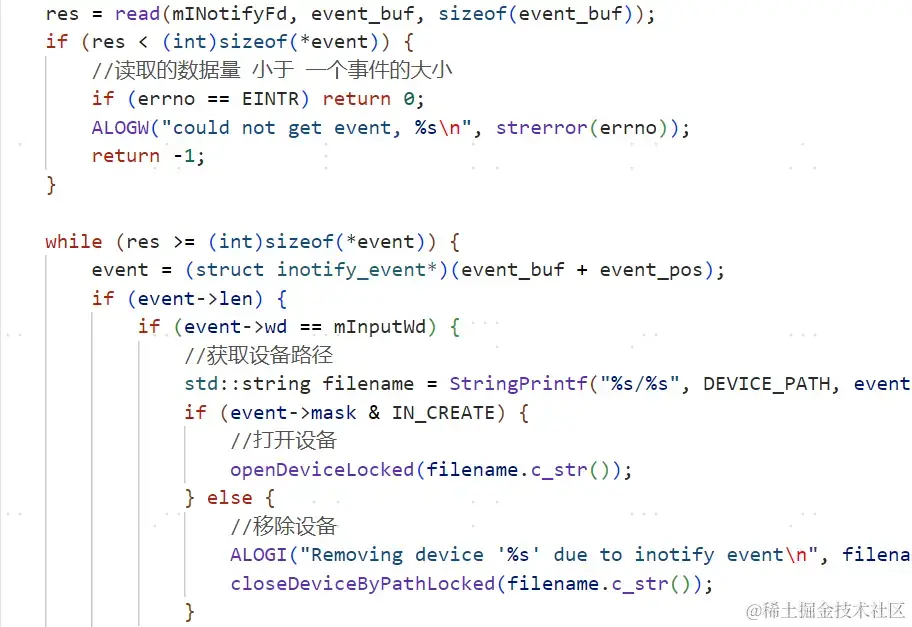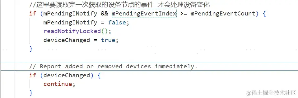上述提到的readNotifyLocked这里可以看到当设备发生改变,且我们读完了当次从epoll获取的所有事件后,会设置devicesChanged为true,从而执行continue跳出当次循环