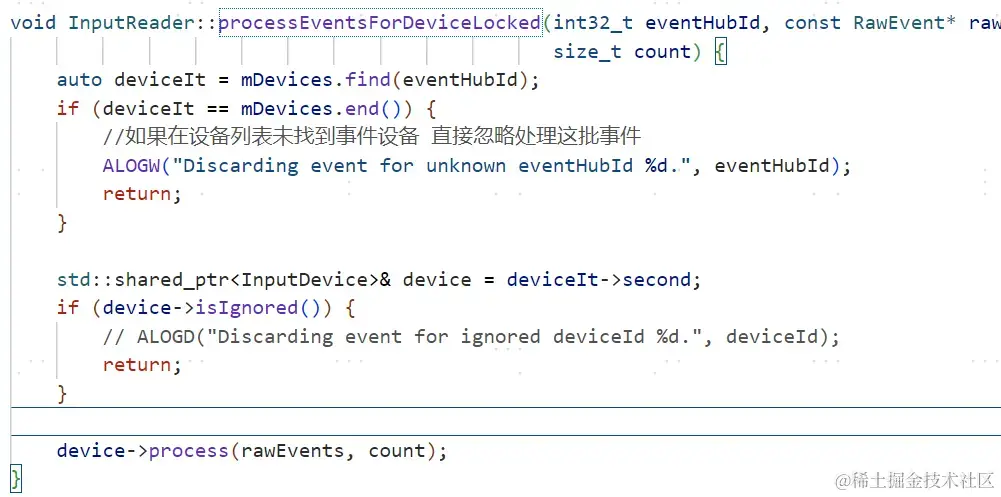 这里获取对应设备的输入事件调用processEventsForDeviceLocked处理