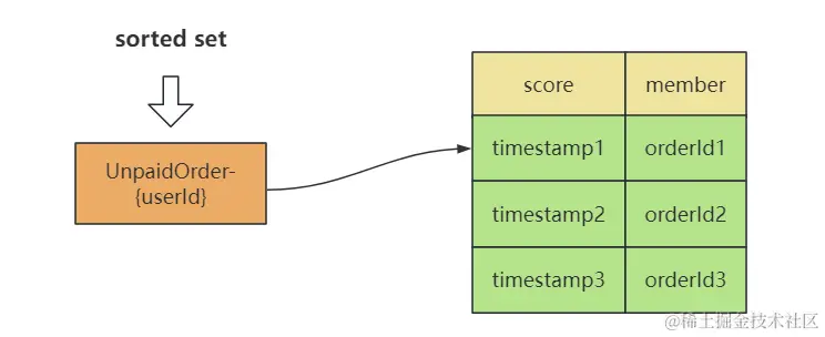 zadd UnpaidOrder-{userId} redis.Z{Score: {timestamp1}, Member: {order1}}