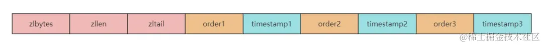 ZipList 是一个数组的形式,存储数据时分为列表头部分和数据部分,列表头部分有 3 个元素: