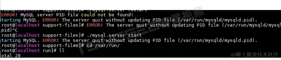 5)继续启动数据库发现,是数据库缺失mysql.pid文件才导致程序无法链接mysql;