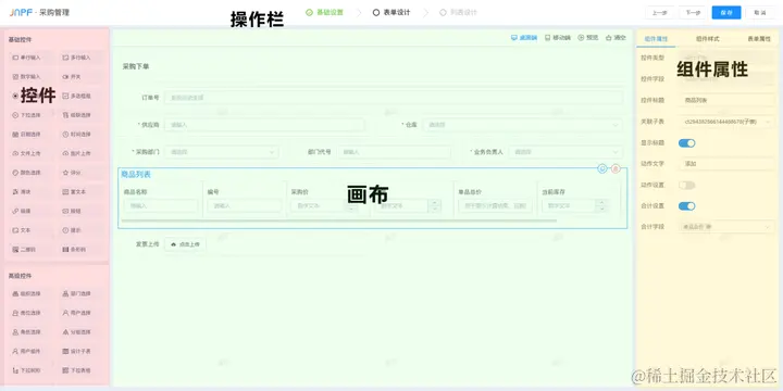 和市面上绝大部分可视化操作平台一样,将界面布局分为 3 个区域:左侧的控件选择区,中间的浏览交互区和右侧的属性编辑区。这三个区域的排列所对应的也是用户生成页面的操作流程。