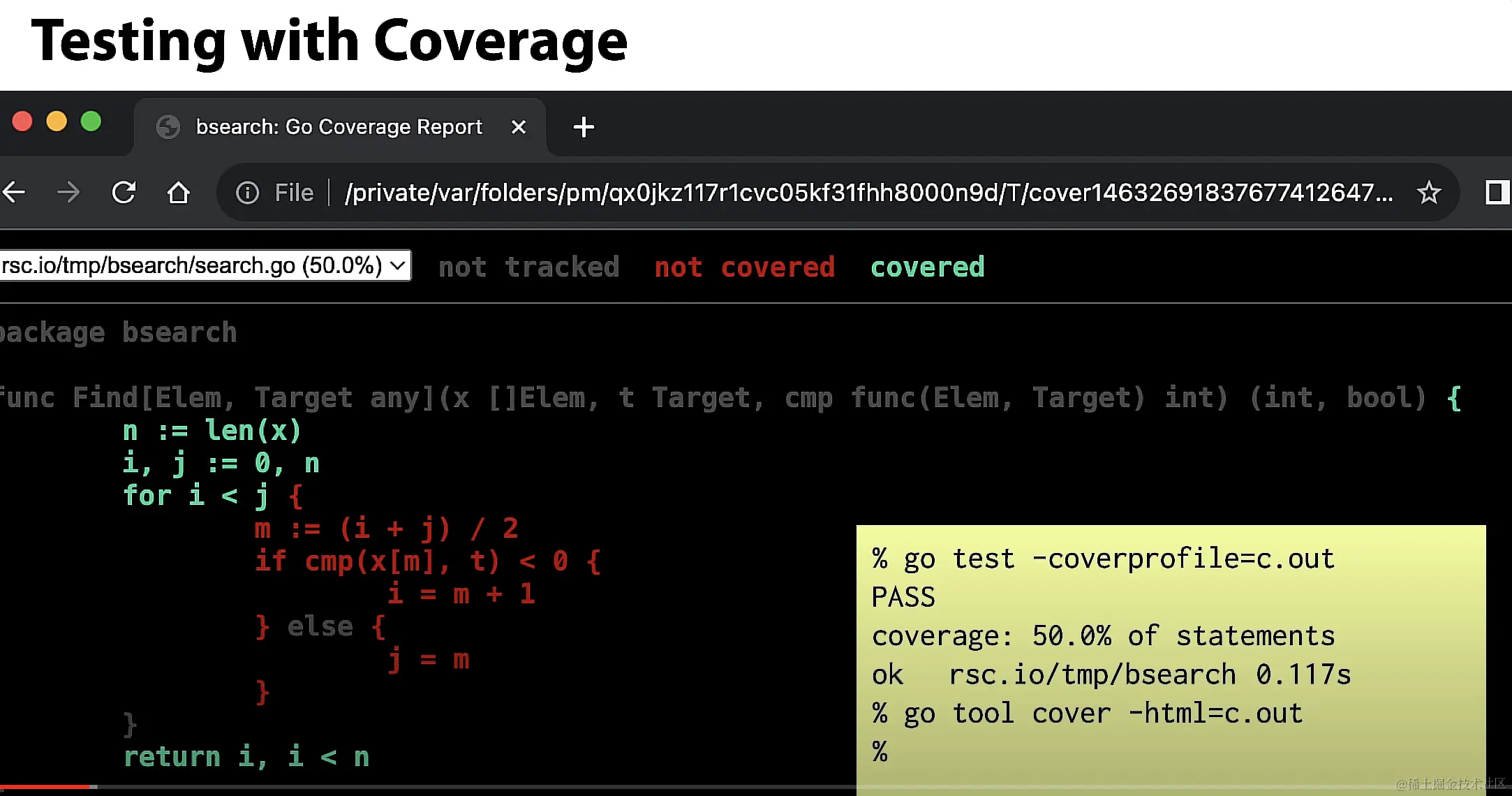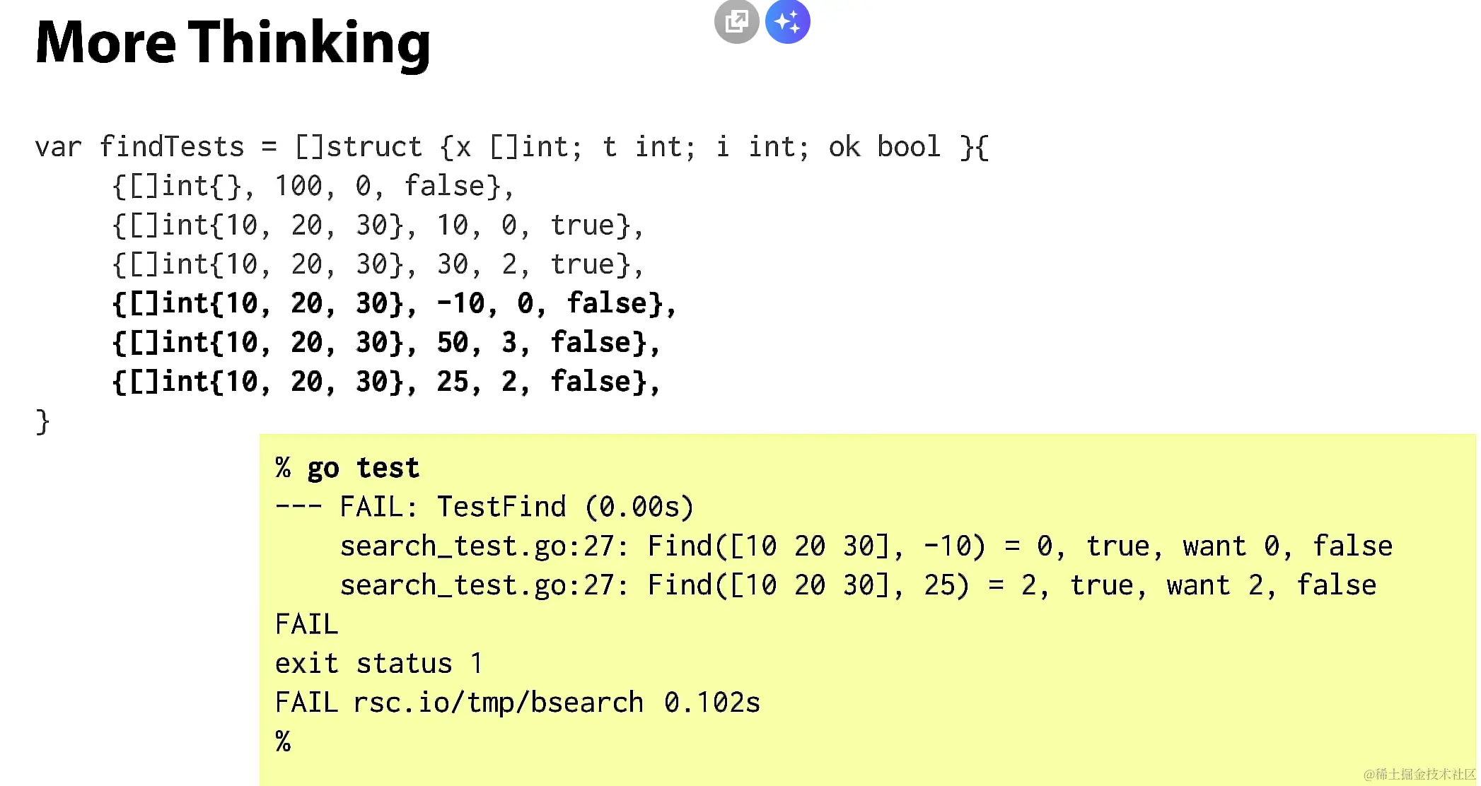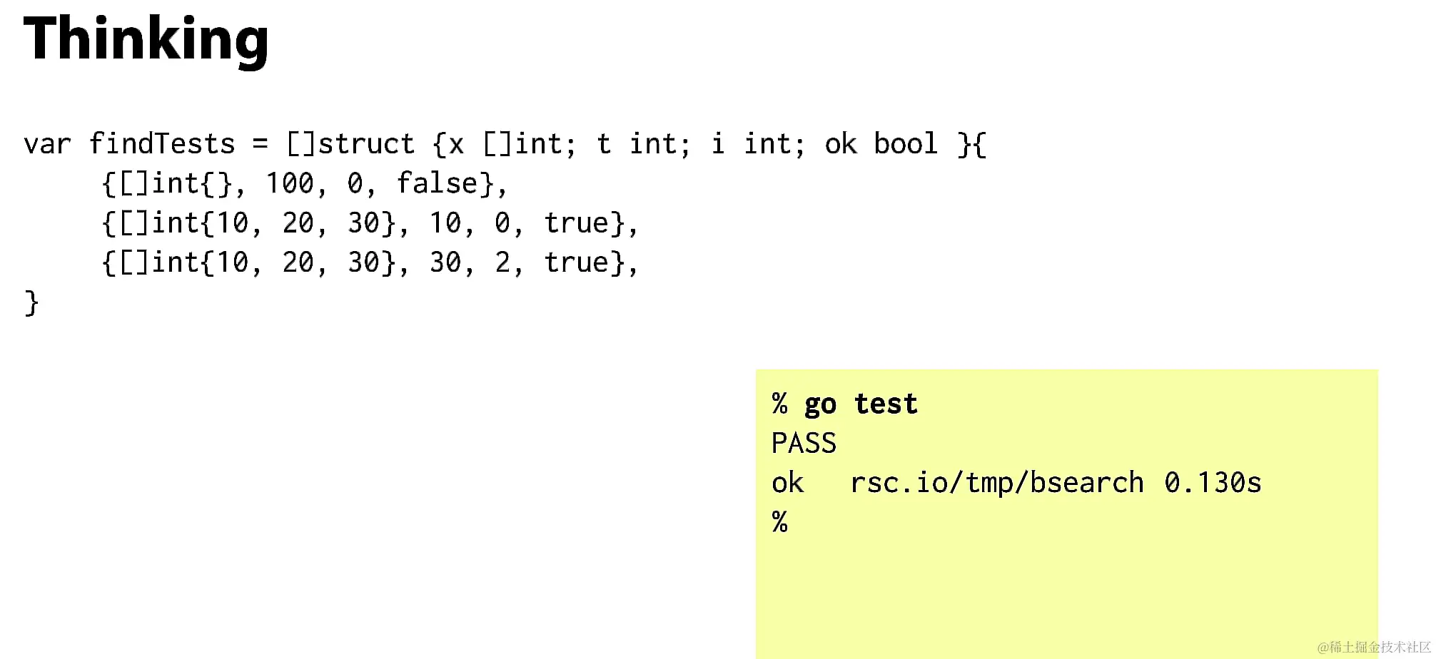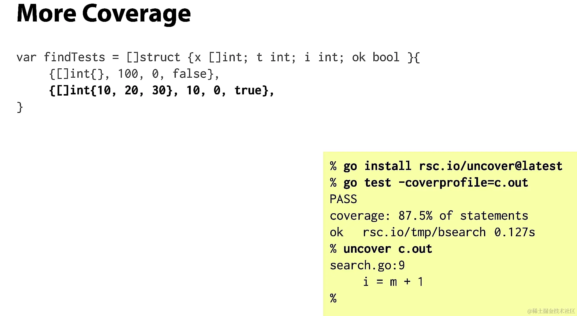 那么这里有什么遗漏呢?需要注意的一件事是,唯一找不到目标的测试用例 有一个空的输入切片,我们应该检查是否在带有值的切片中找到目标(情况),具体而言,我们应该检查目标小于所有值、大于所有值以及位于值中间时的情况。