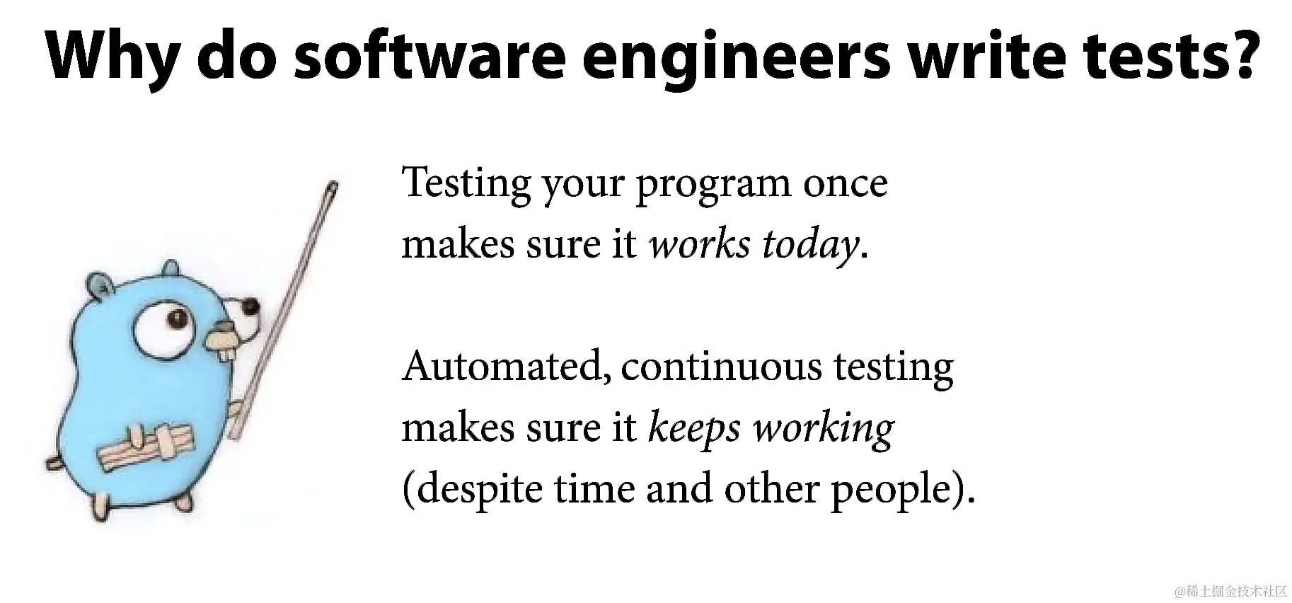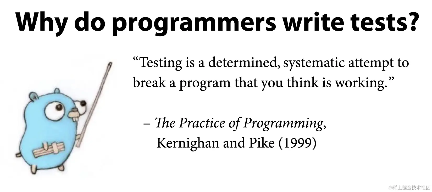 这次演讲的主题是编写好的测试,但首先让我们思考一下为什么需要编写测试。为什么程序员要编写测试呢?编程相关的书籍说,测试是用来发现程序中的错误。例如这本书说“测试是对认为正常运行的程序进行有决心、系统的破坏尝试。”