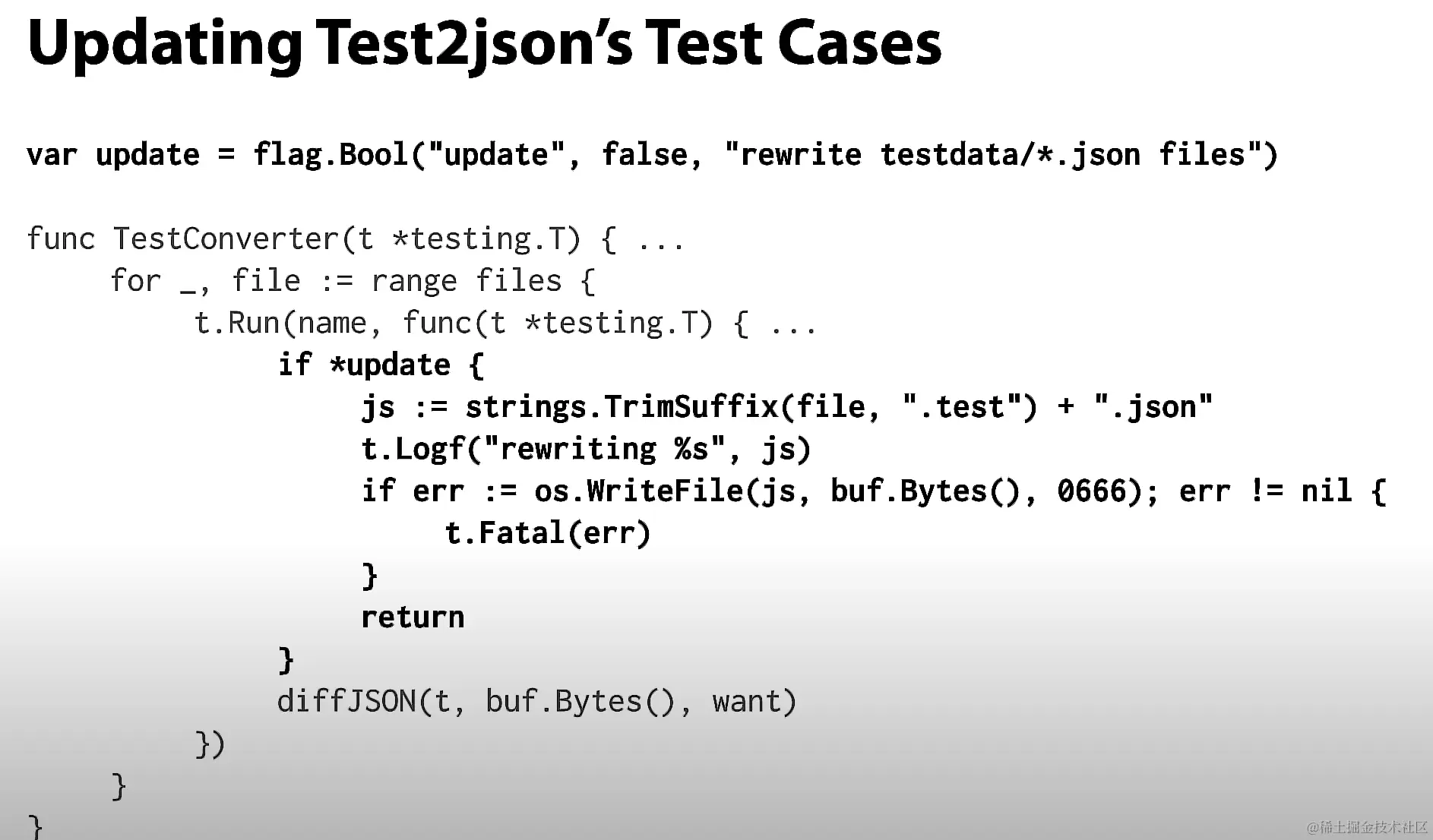 这是 test2json 的更新代码。该测试定义了一个新标志 -update。当该标志为true时,测试会将计算出的答案写入答案文件,而不是调用 diffJSON。