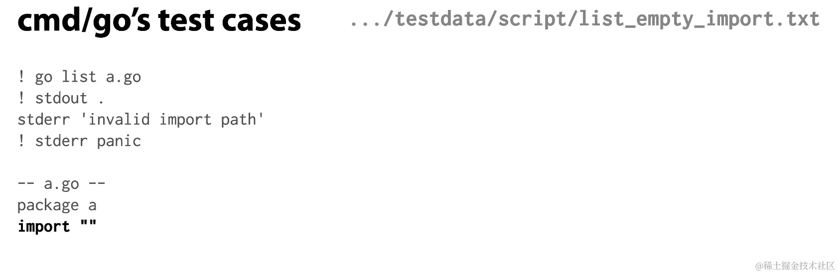 请注意底部的a.go是一个无效程序,因为它正在导入一个空字符串。感叹号在第一行开头是一个NOT运算符。! go list a.go 意味着go list a.go应该失败。