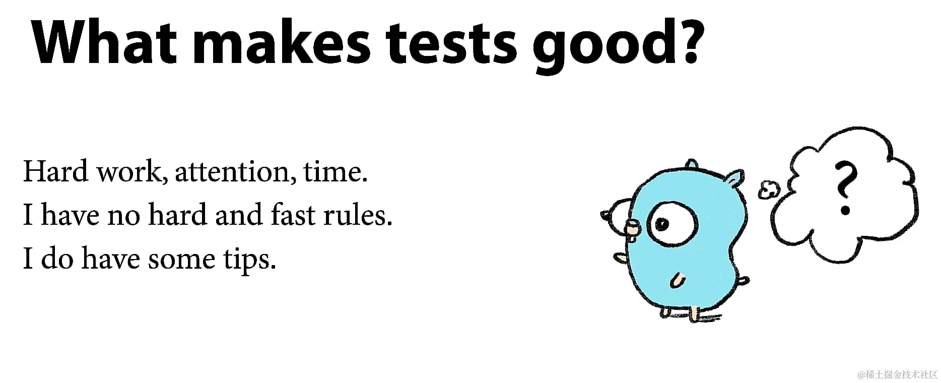 为了确信你的程序在其他人编辑时不会中断,并确信你的程序在测试全部通过时可以随时投入到生产,你需要一套非常好的测试。但一般来说,什么使测试变得好呢? 一般来说, 使测试代码变得优秀的因素与使非测试代码变得优秀的因素是一样的:努力工作、注意力和时间. 对于编写良好的测试代码,我没有任何灵丹妙药或硬性规则,就像对于编写良好的非测试代码一样. 不过,我确实收集了一些在 Go 上行之有效的技巧,我将在本次演讲中分享 20 条技巧.