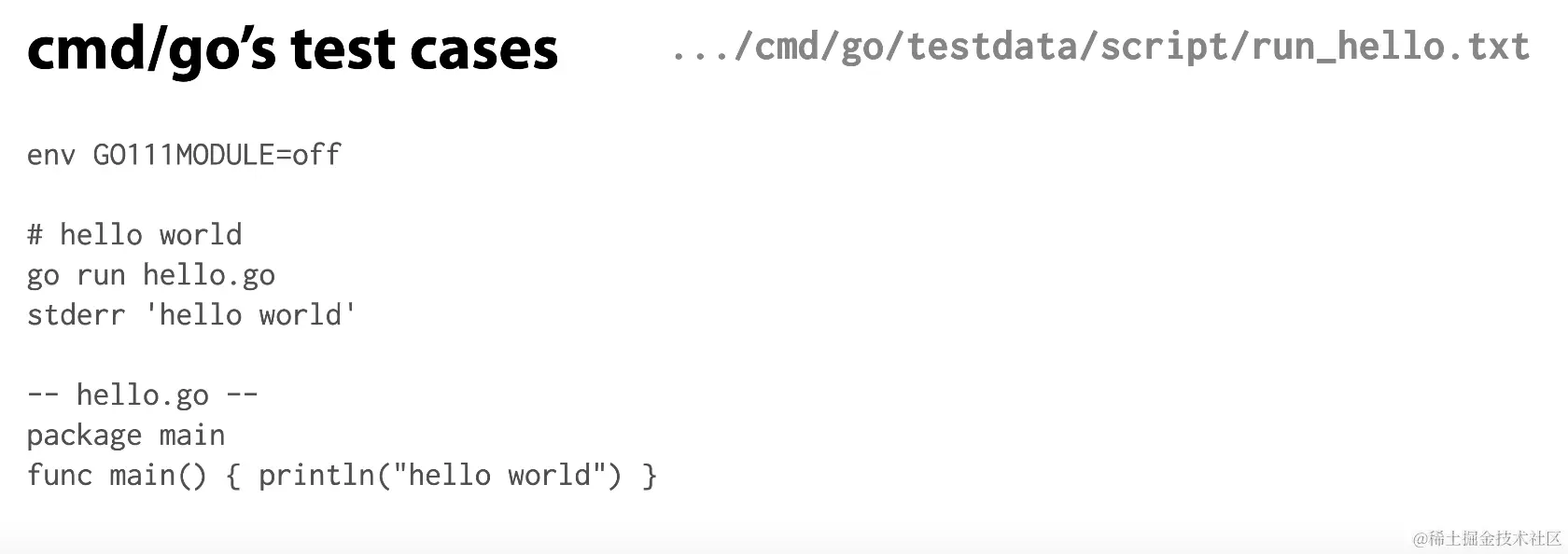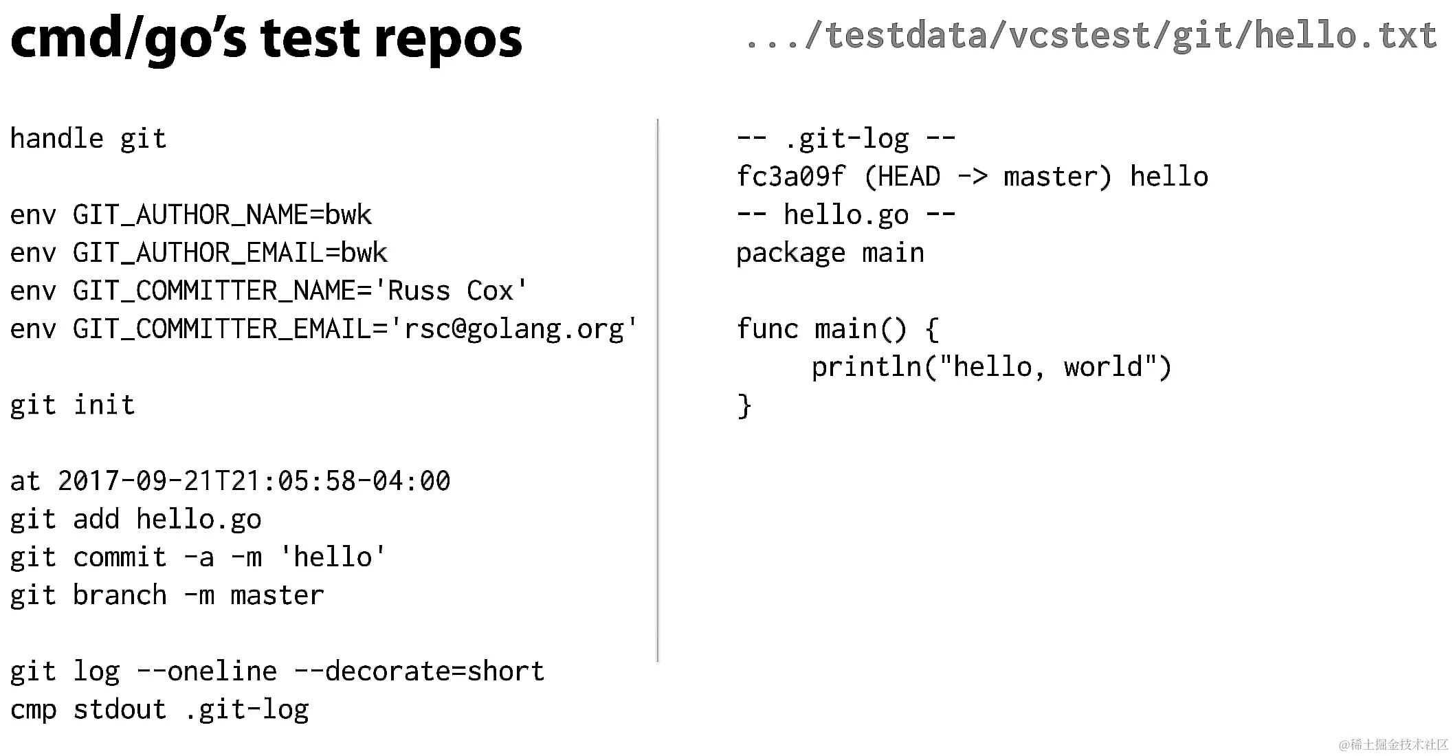 们提取脚本引擎的动机是为了在 Go 命令测试的不同部分中重复使用它。这个脚本用于准备一个 Git 仓库,其中包含我们在常规 Go 命令脚本测试期间要导入的模块。你会看到它设置了一些环境变量,执行了实际的 git init,设置时间,并运行更多的 git 命令来将 hello world 文件添加到仓库中,然后验证我们是否得到了预期的仓库结构。这再次提醒我,测试并不是一开始就是这样的,这引出了下一个技巧。
