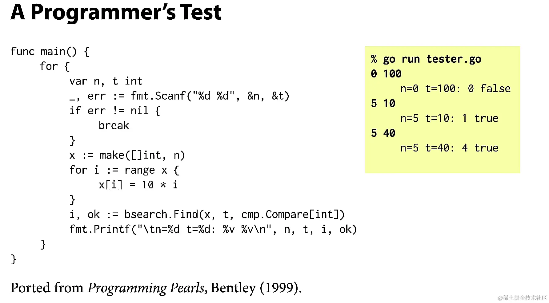 这是一个很好的二分查找功能的交互式测试器。你输入两个数字n和t,它会创建一个由于n个元素组成的切片,其中包含10的递增倍数. 然后在切片中搜索 T 并打印结果,并重复这个过程。这看起来可能很简单. 但有多少人通过运行并研究一段时间来测试生产代码呢?我们都这样做过。