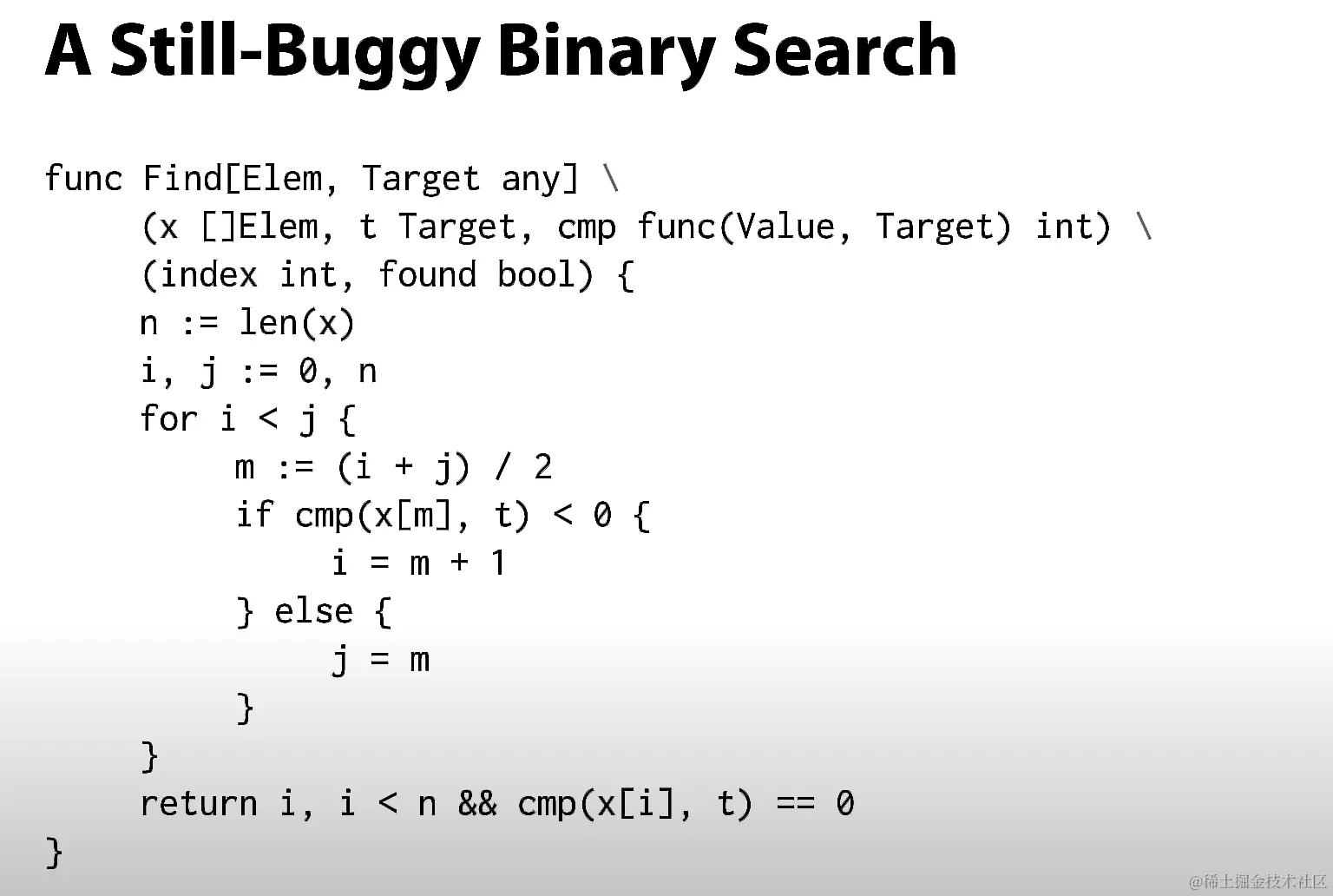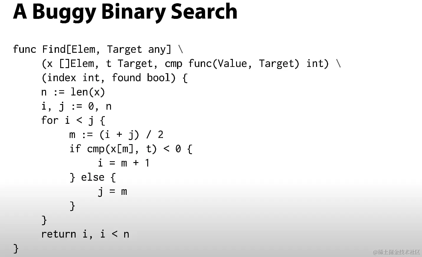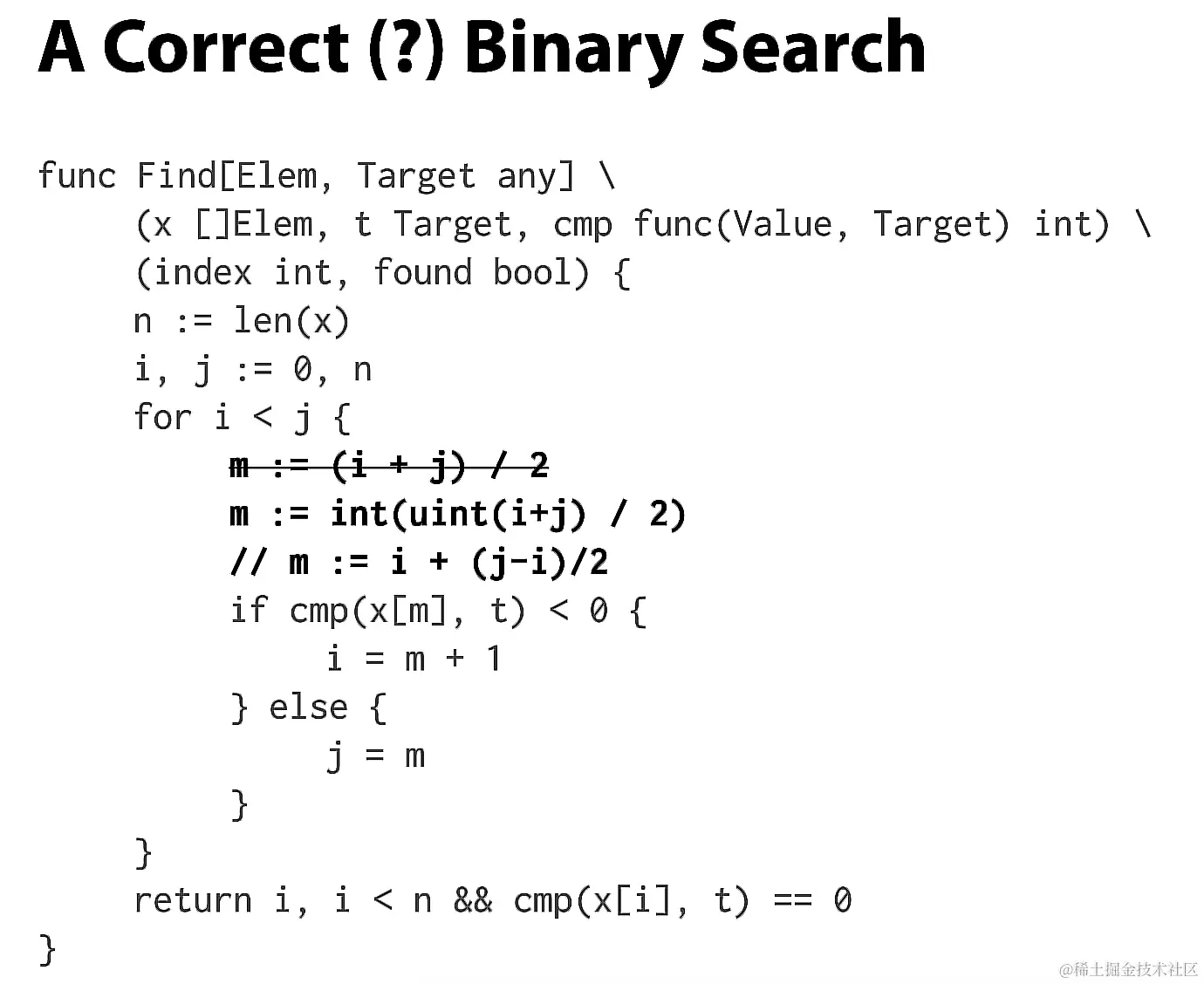 这个bug是,如果切片中的元素数量非常多, 接近int的最大值,那么i + j就会溢出,因此(i+j)/2, 即切片中值的计算是错误的。这个bug在2006年, 在使用64位内存和32位int的C程序中被发现, 该程序对 包含超过10亿个条目的数组进行索引,这种特殊的组合在Go中基本不会发生 (因为在Go中,我们要求64位内存使用64位int,正是为了避免此类问题)。