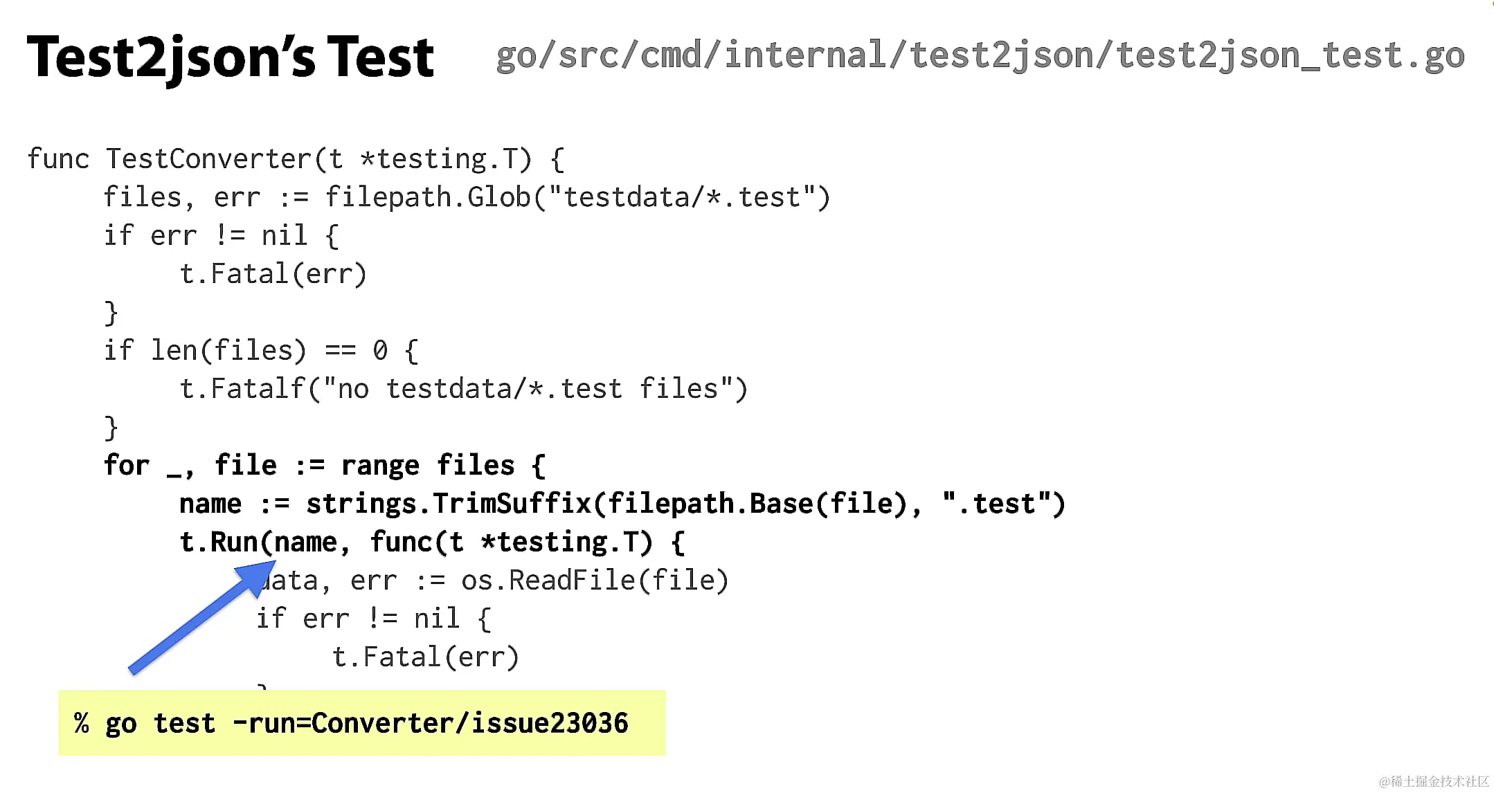 否则,我们将循环遍历所有文件。对于每一个,我们通过使用基本文件名(不带testdata/目录名,也不带文件后缀)来创建一个子测试名称。然后我们用该名称运行一个子测试。