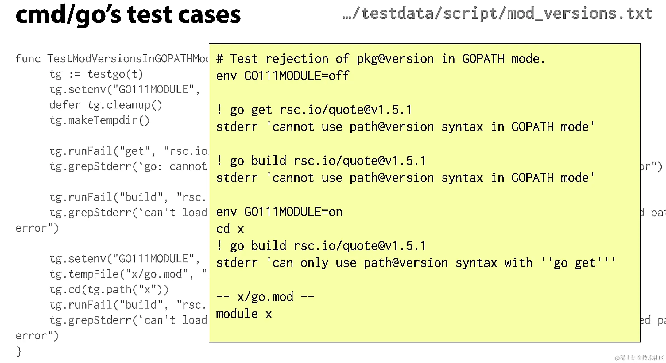 现在,我想向你展示我曾经做过的一些最高质量的测试,即go命令的测试。这些汇集了我们迄今为止看到的许多想法。