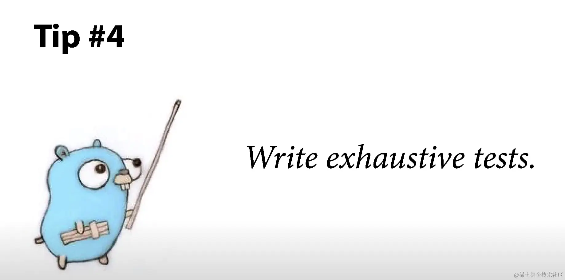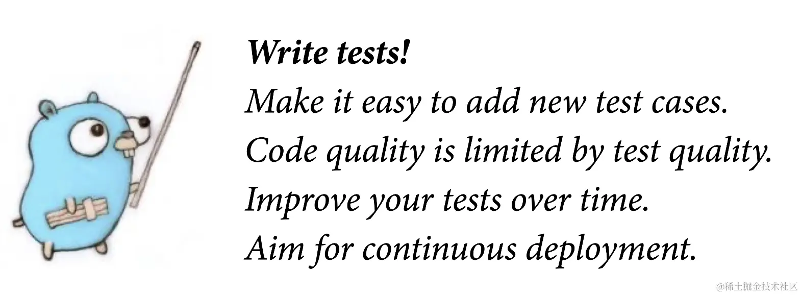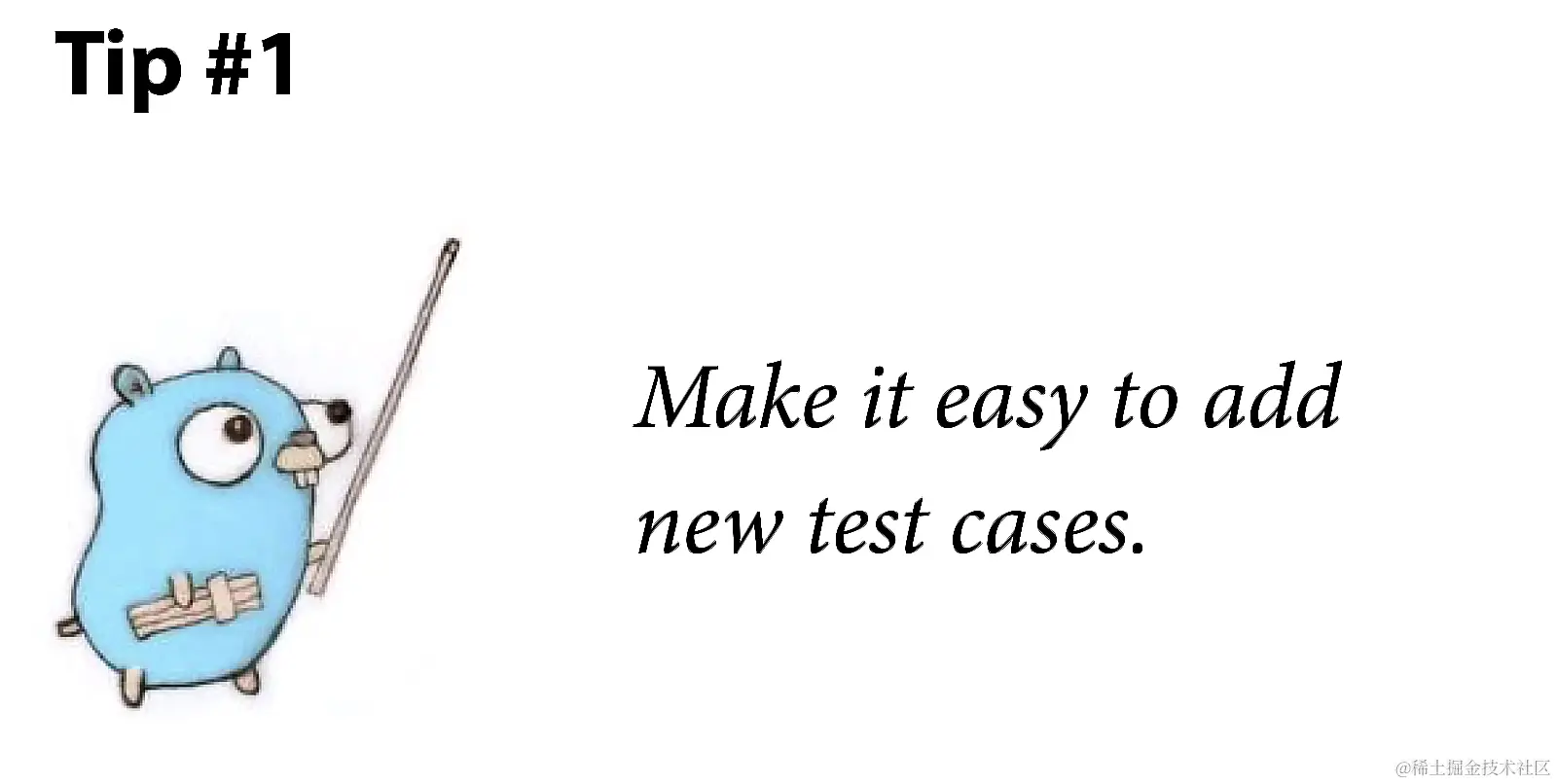 这是最重要的建议,因为如果添加新的测试用例不容易,你就不会去做。Go在这方面已经有所帮助,我们专门设计Go测试,使其非常容易编写。