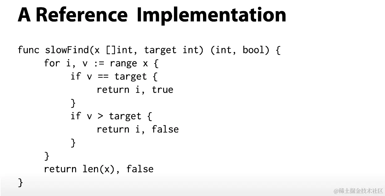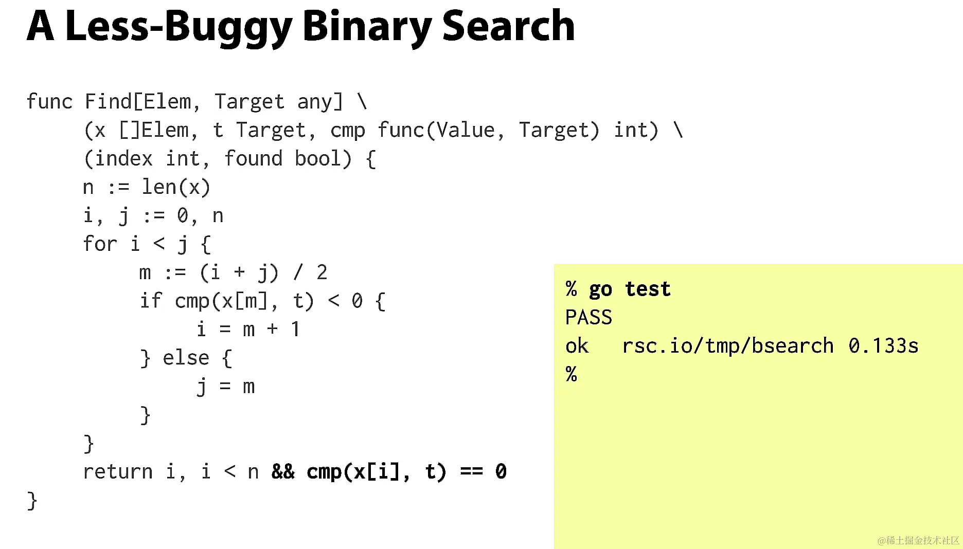 让我们先从二分查找函数的测试开始。这个函数 find 接受一个排序好的切片,一个目标值和一个比较函数,它使用二分查找来找到并返回两件事:首先是目标值如果存在的话应该出现的索引,其次是一个布尔值,表示目标值是否存在。大多数二分查找都有bug,这个也不例外。让我们来测试一下.