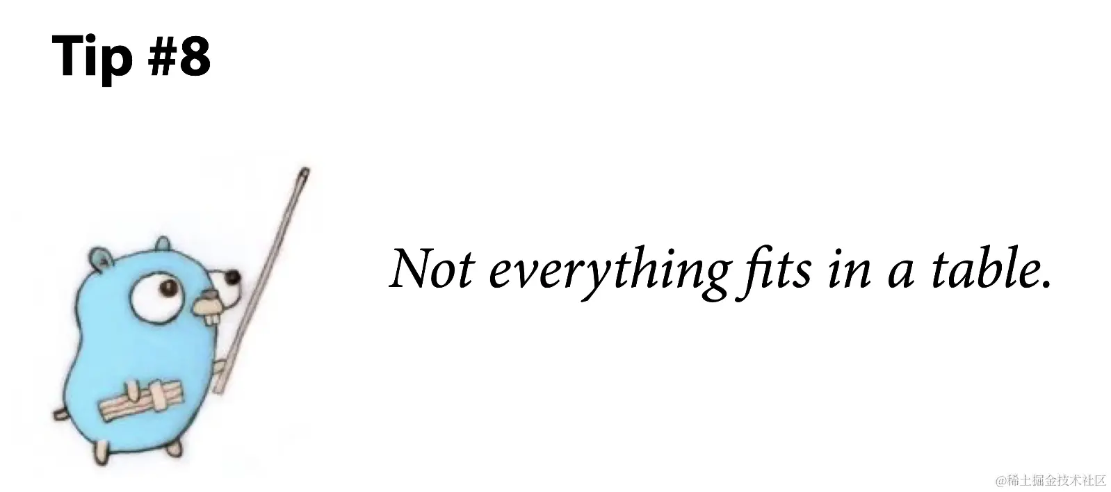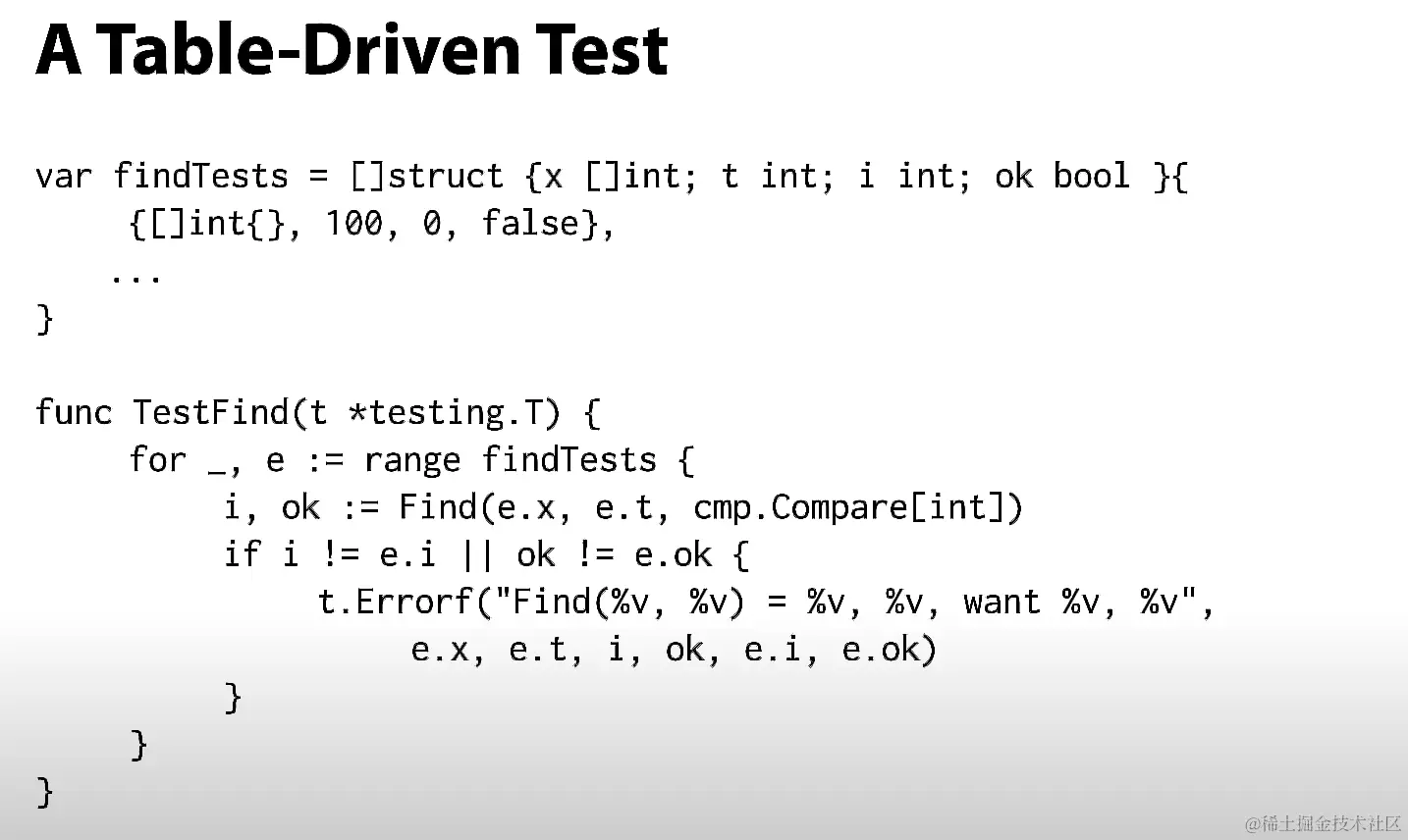 在包测试的级别上,这已经很好了,但在特定的包中,还可以做得更好。 我相信你知道表驱动测试。我们鼓励表驱动测试,因为它使添加新的测试用例变得非常容易。