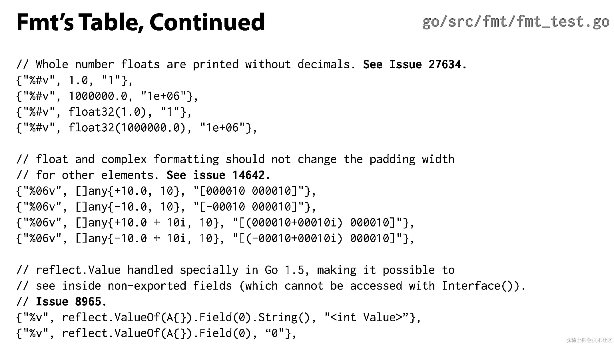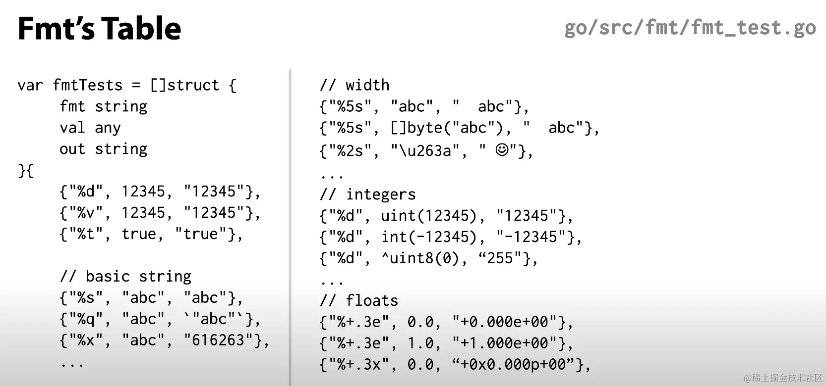 很多东西确实可以放在一张表格中, 这是我最喜欢的测试表之一,来自fmt.Printf测试。每一行都是一个printf格式,一个值的和预期的字符串。