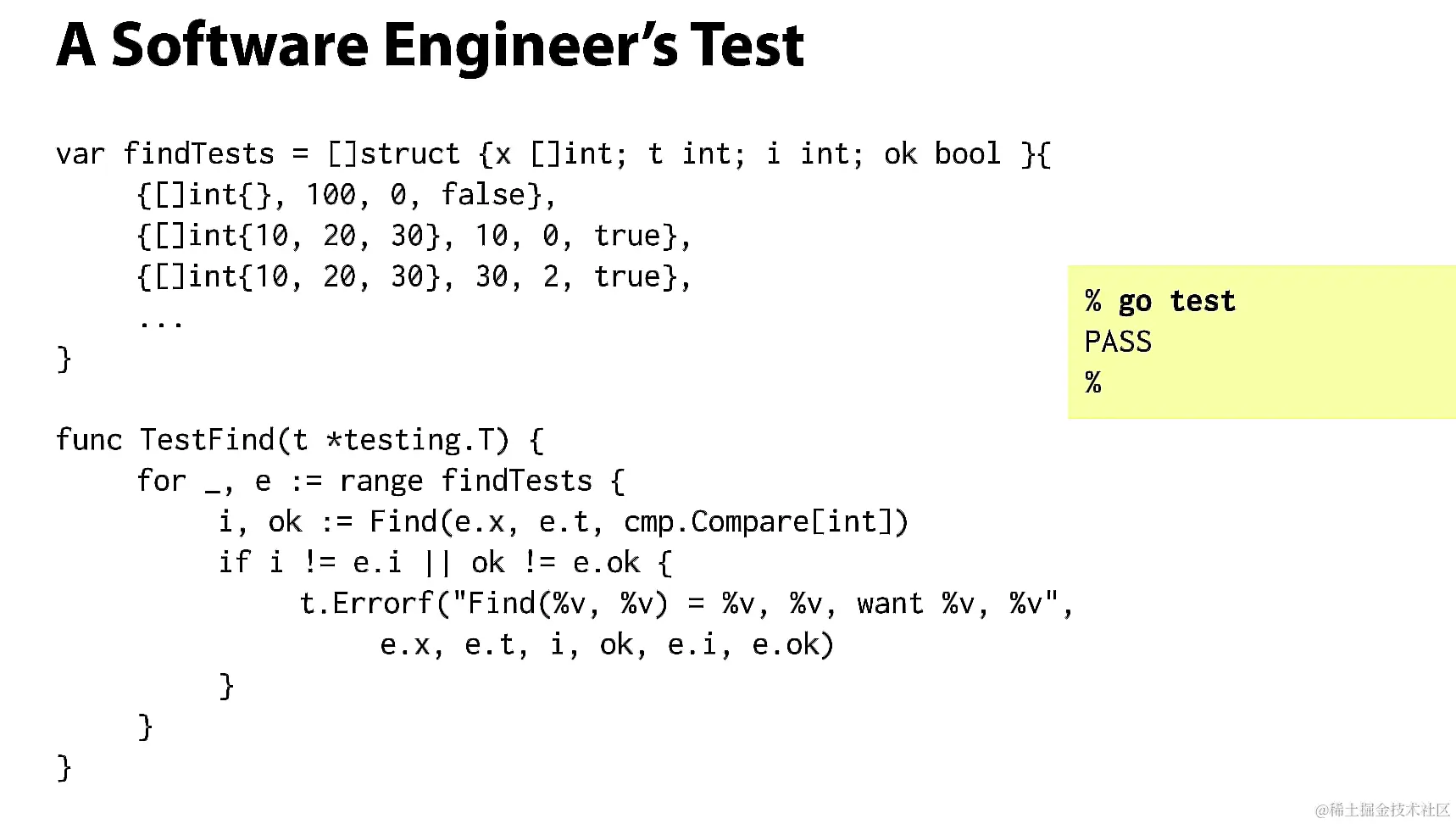 结果表明,这个详尽的测试通过了,我们的想法相当不错。如果详尽测试失败,那意味着find和slowFind不一致,因此至少有一个是有bug的,但我们不知道是哪一个。添加一个对slowFind的直接测试 很容易,因为我们已经有一个测试数据表,这也是表驱动测试的另一个好处,表可以用于测试多个实现。