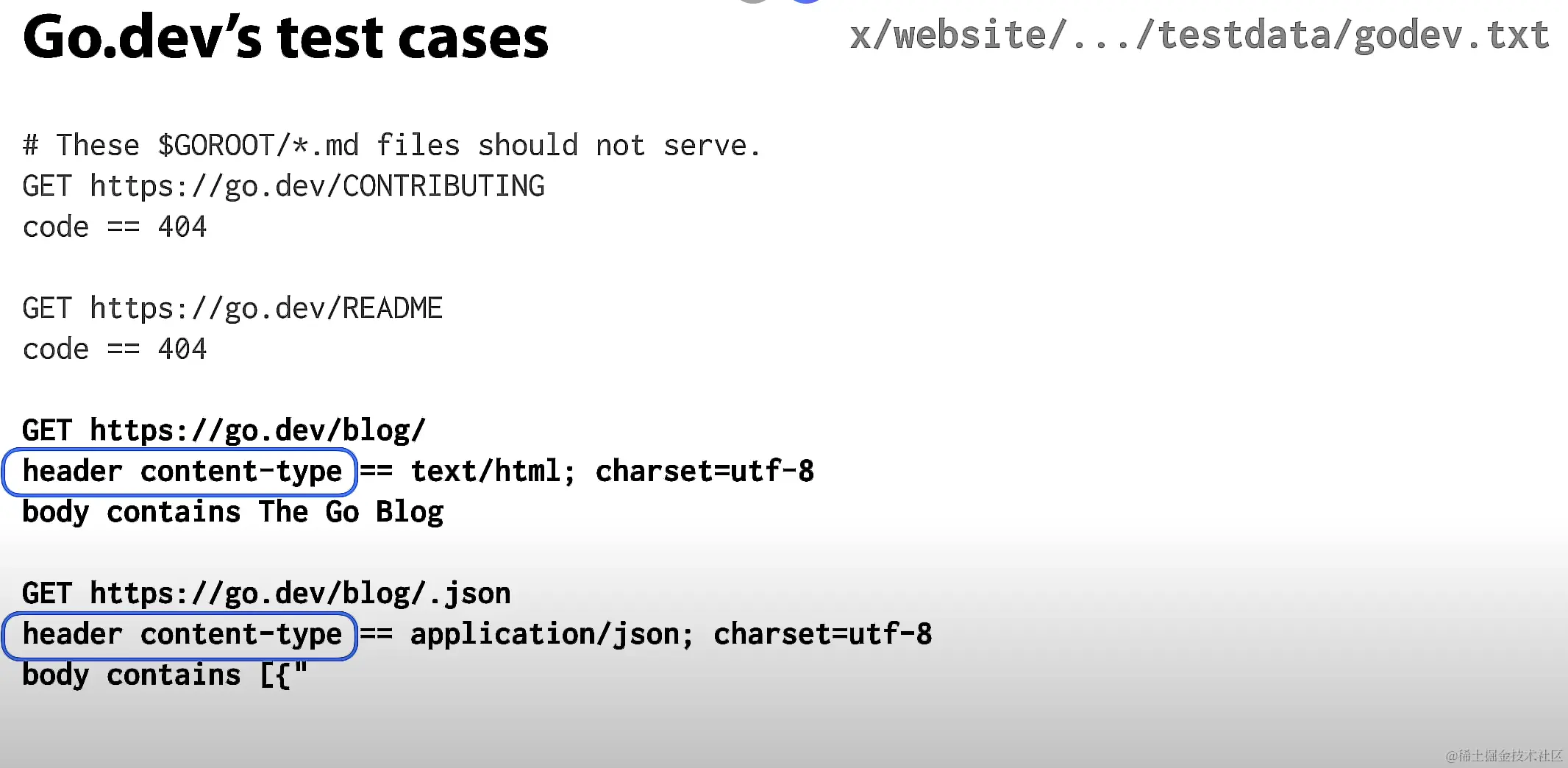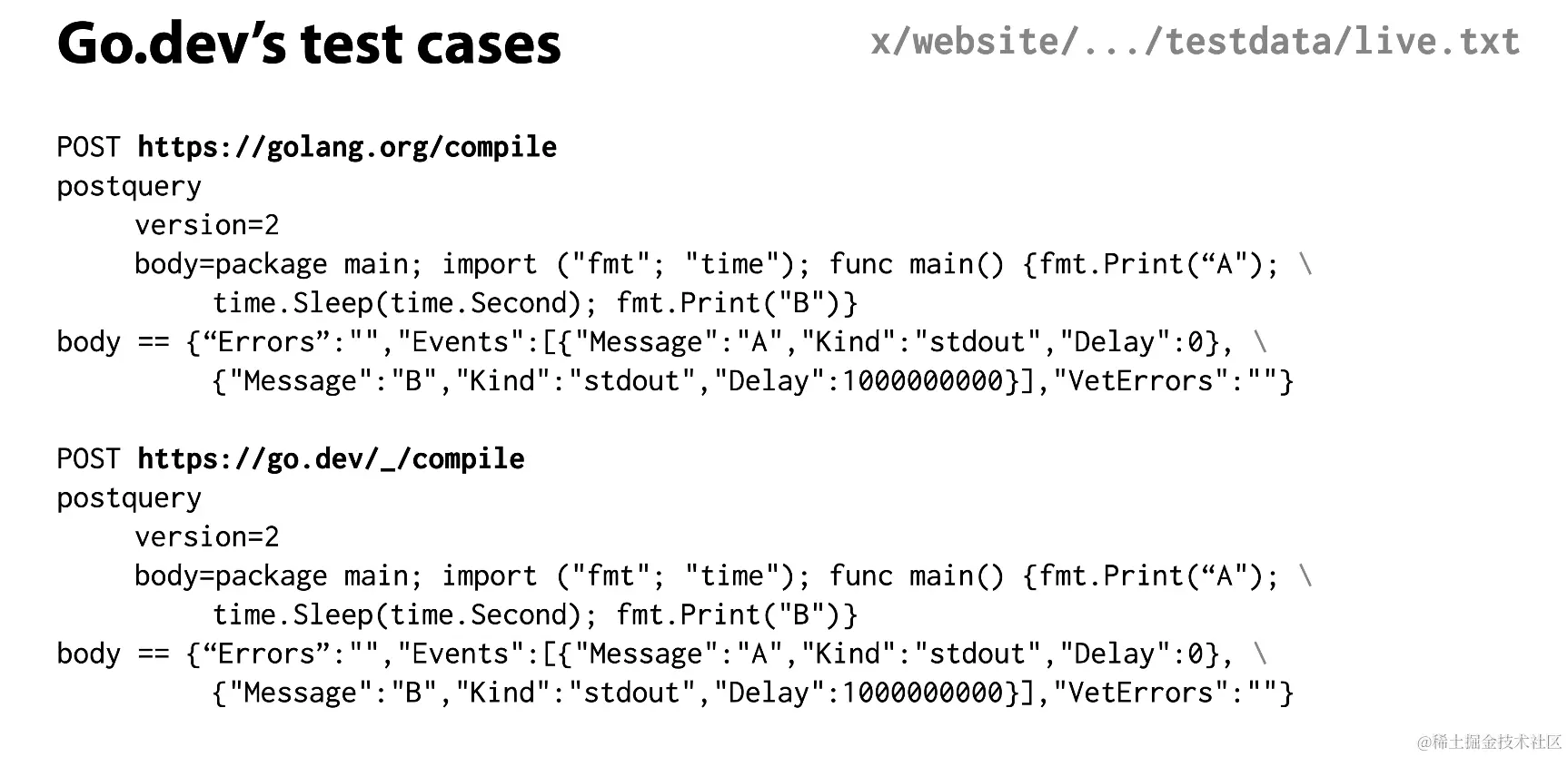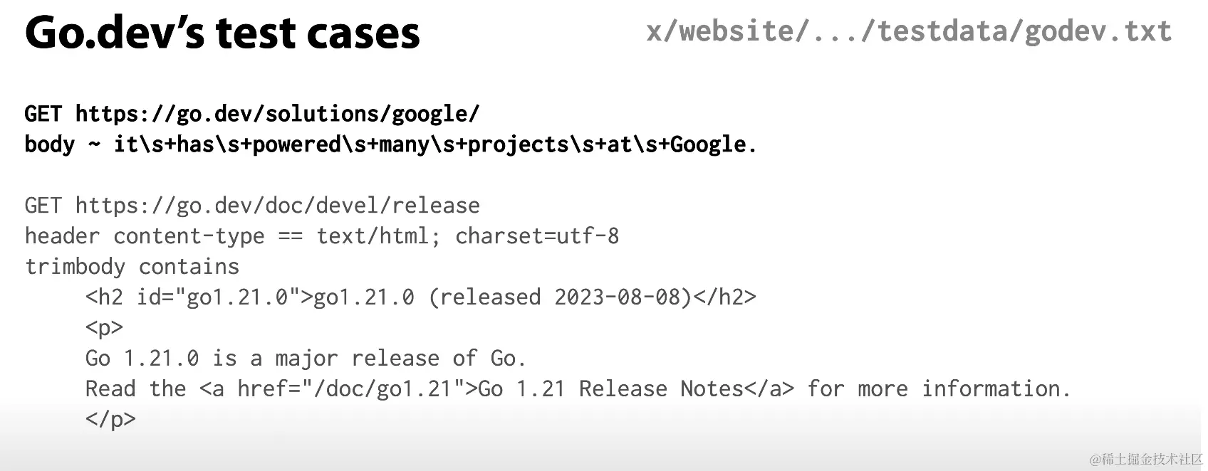 下面是它们的样子:每个测试都从一个 HTTP 请求开始。这里我们获取了 go.dev 的主页面。然后是关于响应的断言。每个断言的格式都是字段、运算符、值。这里,字段是 body,运算符是 contains,值是 body 必须包含的文字文本。这个测试在检查页面是否渲染,因此它检查了基本文本和副标题。为了使编写测试变得更容易,根本没有引用:值只是运算符后面的行的其余部分。