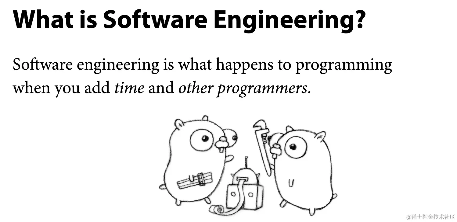 译者评注: 看来Russ Cox很喜欢讲啥是软件工程,上个演讲[Go Changes]( "Go Changes")也提到了..