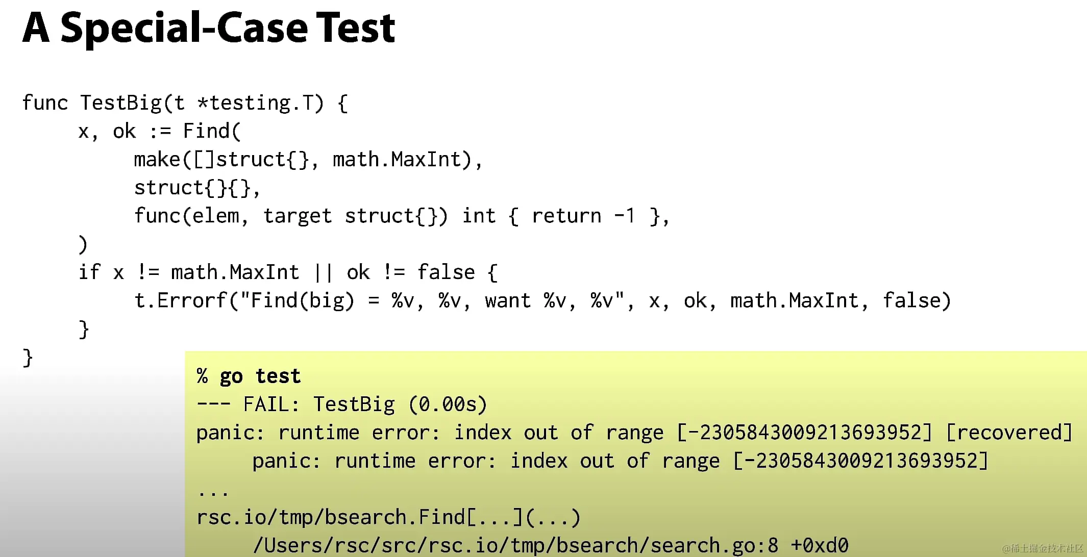 在这种情况下,有一个更巧妙的办法,因为通常是为了测试难以发现的错误,我们可以创建一个空结构体切片,无论有多长, 都不会占用内存。此测试在MaxInt 空结构体切片上调用Find,寻找一个空结构体作为目标,但随后传入的比较函数始终返回-1,要求(claiming)切片元素小于目标。这将使二分查找检查切片中越来越大的索引,这就是我们达到溢出的方式。