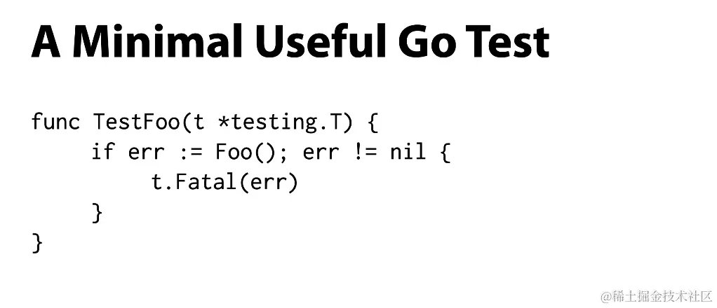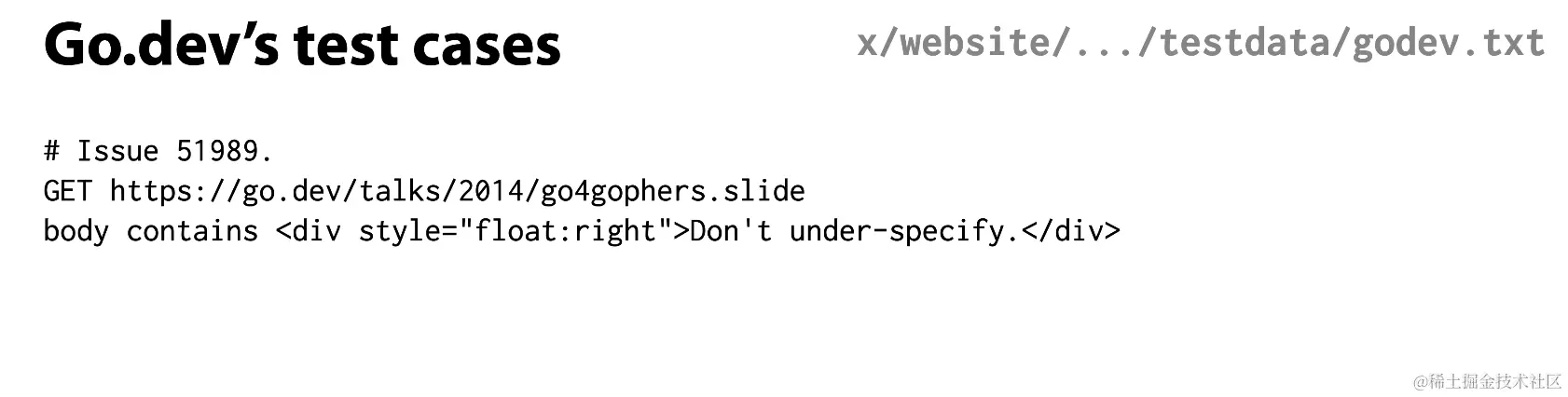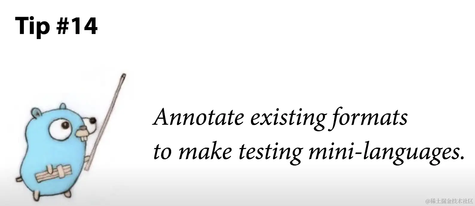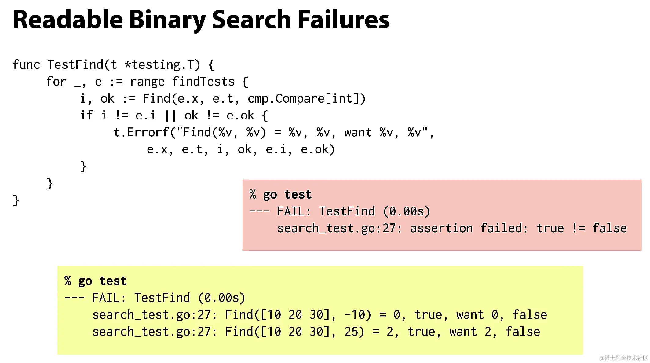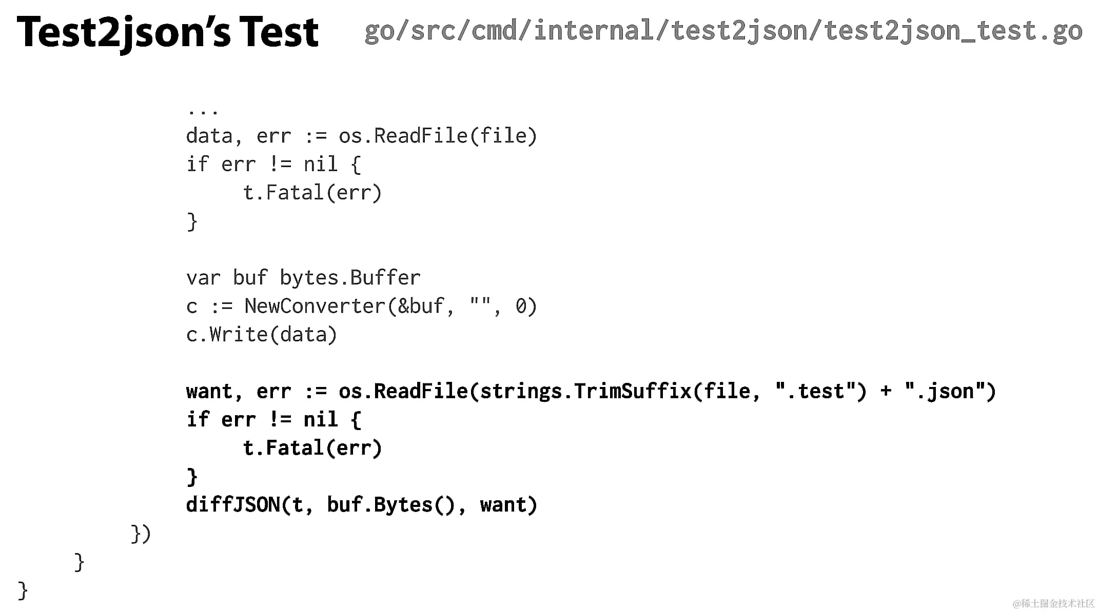 最后,如果结果不是我们想要的,会打印错误。这很像是表驱动测试,只是我们解析文件而不是遍历表格。它不适合放在一个幻灯片上,但开发时确实可以放在一个屏幕上(译者注: 这后半句未解其意)。