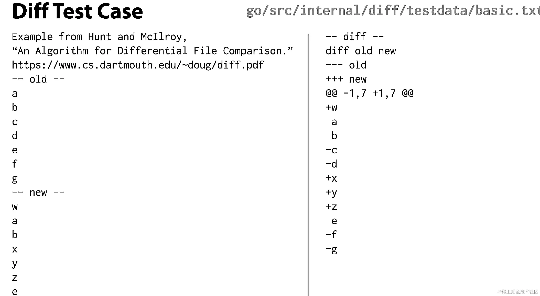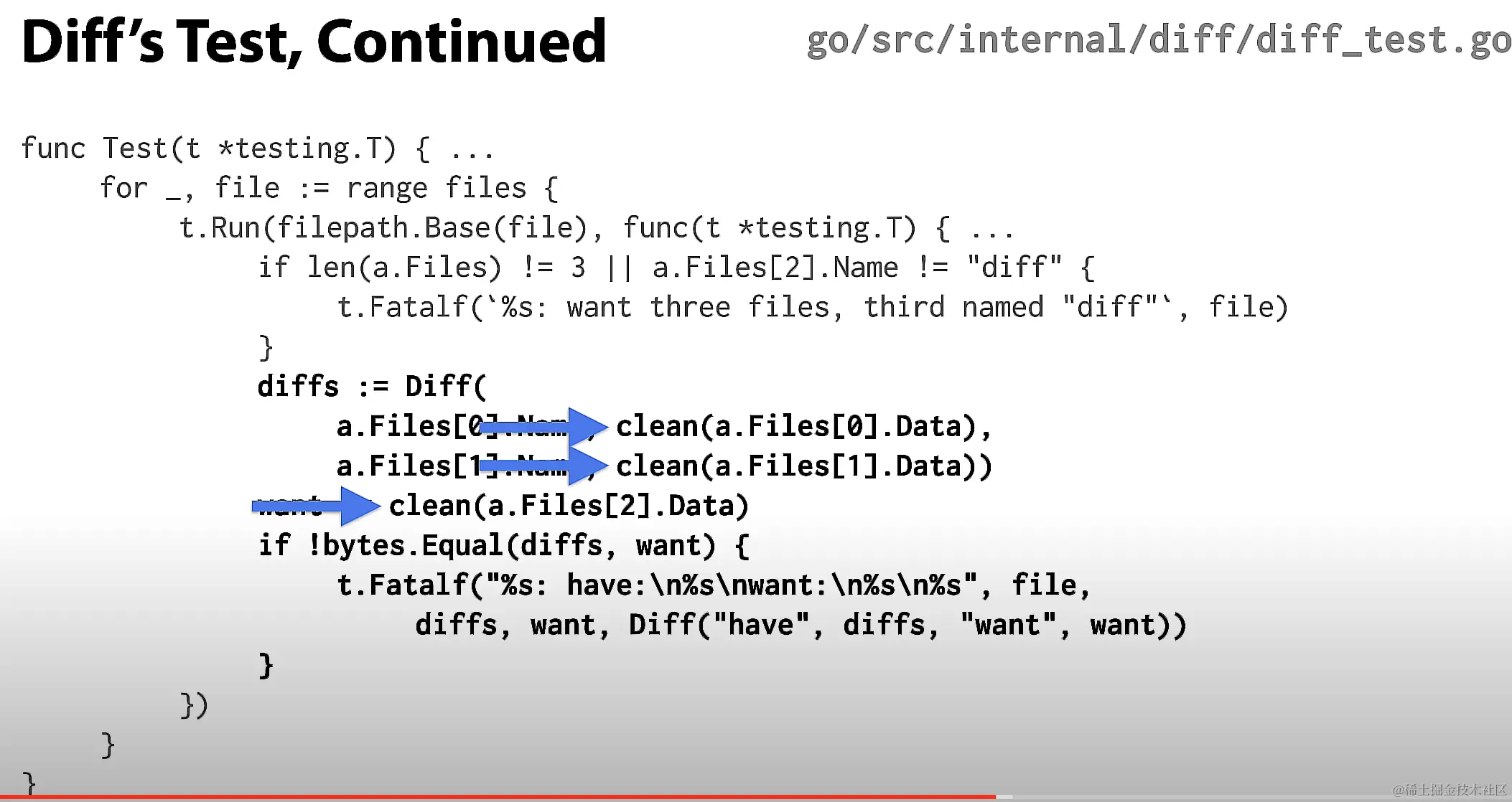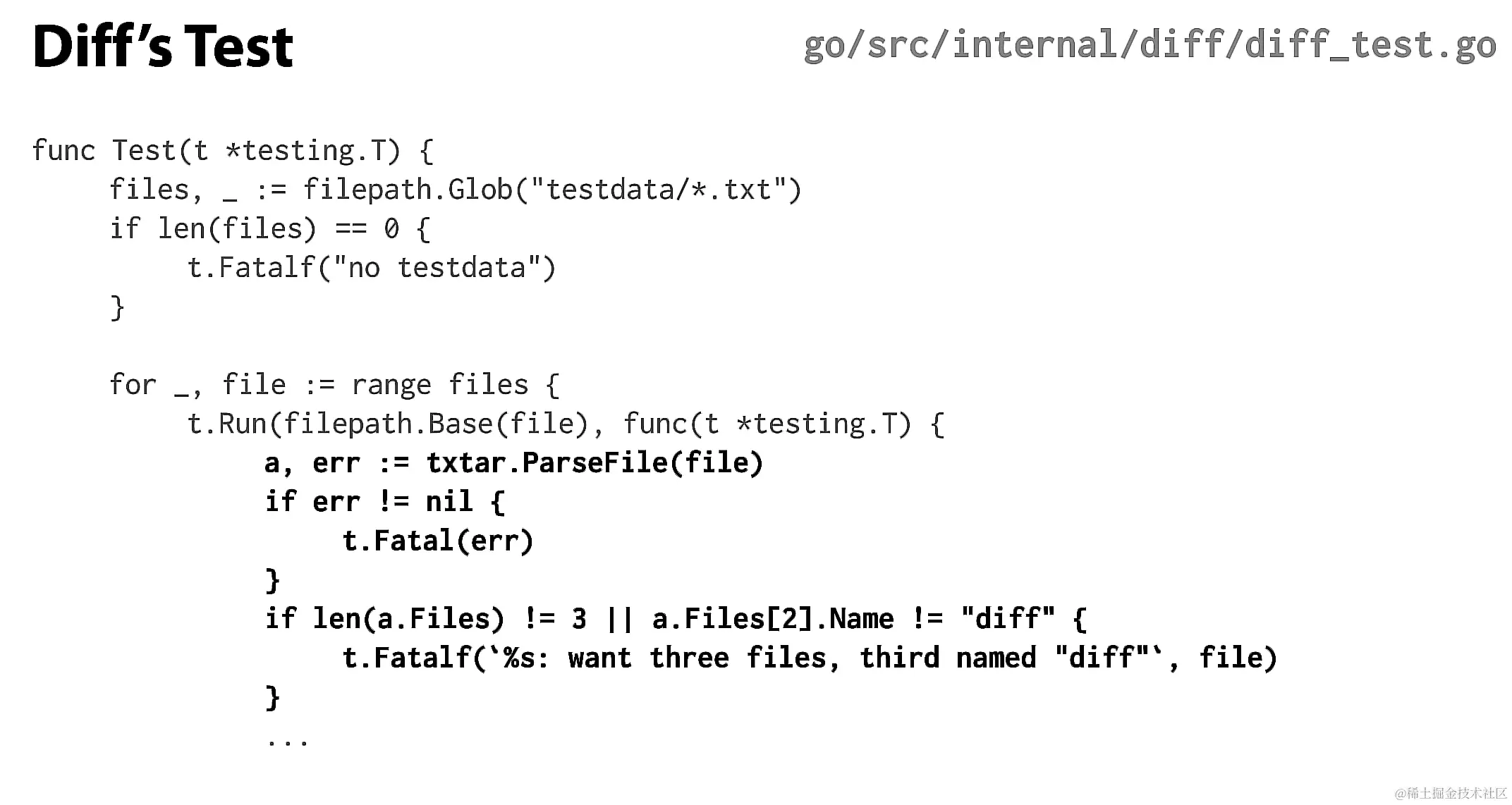 使用txtar文件几乎和编写它们一样简单。这是我们正在查看的diff包的测试。这是通常的基于文件的循环,但我们在文件上调用txtar.ParseFile。然后我们坚持认为存档包含三个文件,第三个文件名为diff。然后我们比较两个输入文件并检查结果是否与预期的差异相符。这就是整个测试。