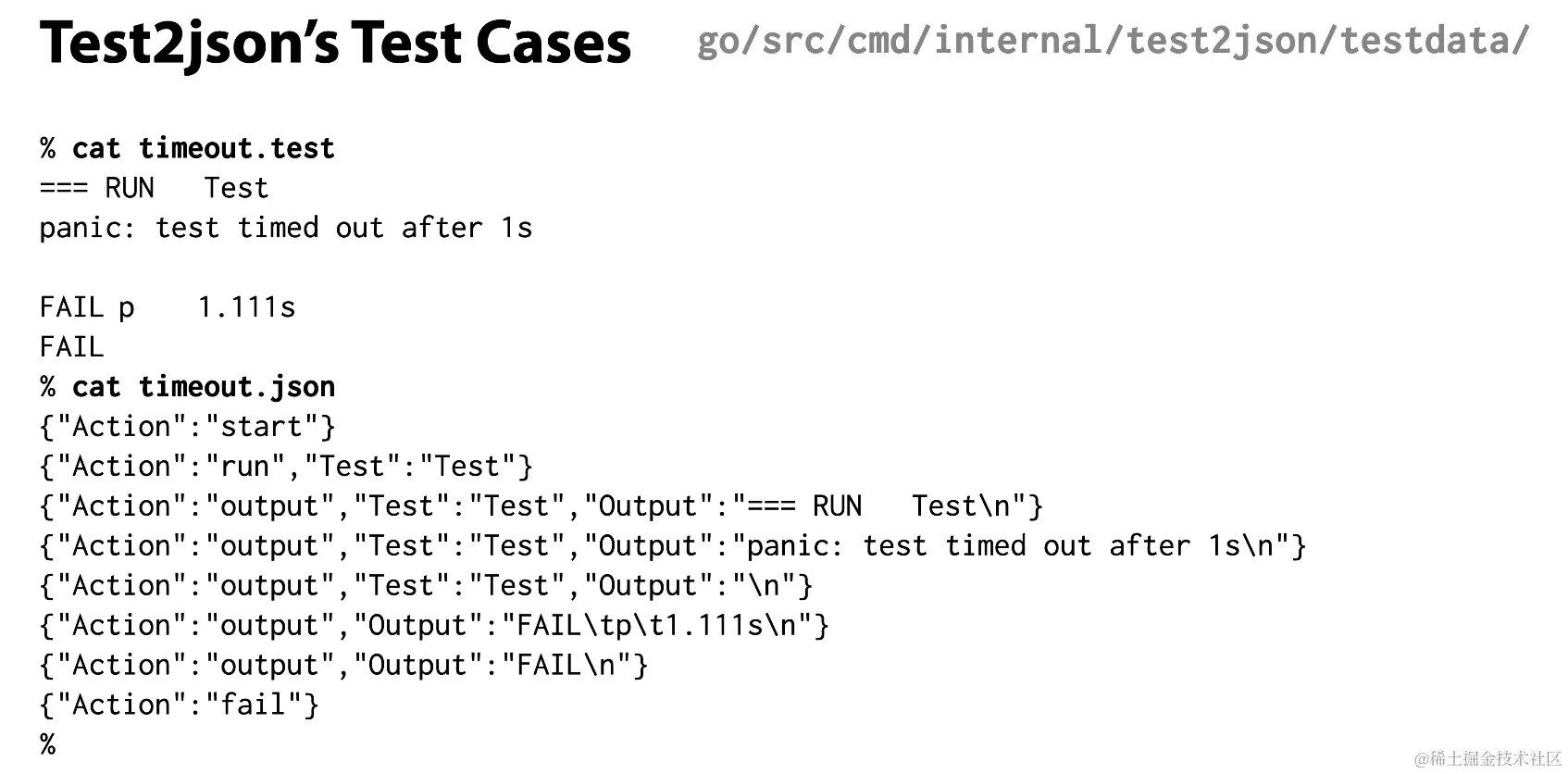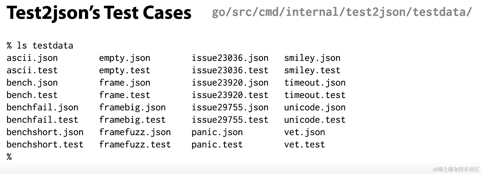在文件中存储测试用例的另一种方法,是使用一对文件,一个用于输入,一个用于输出。为了实现go test -json,有一个名为test2json的程序,它读取测试输出并将其转换为JSON输出。
