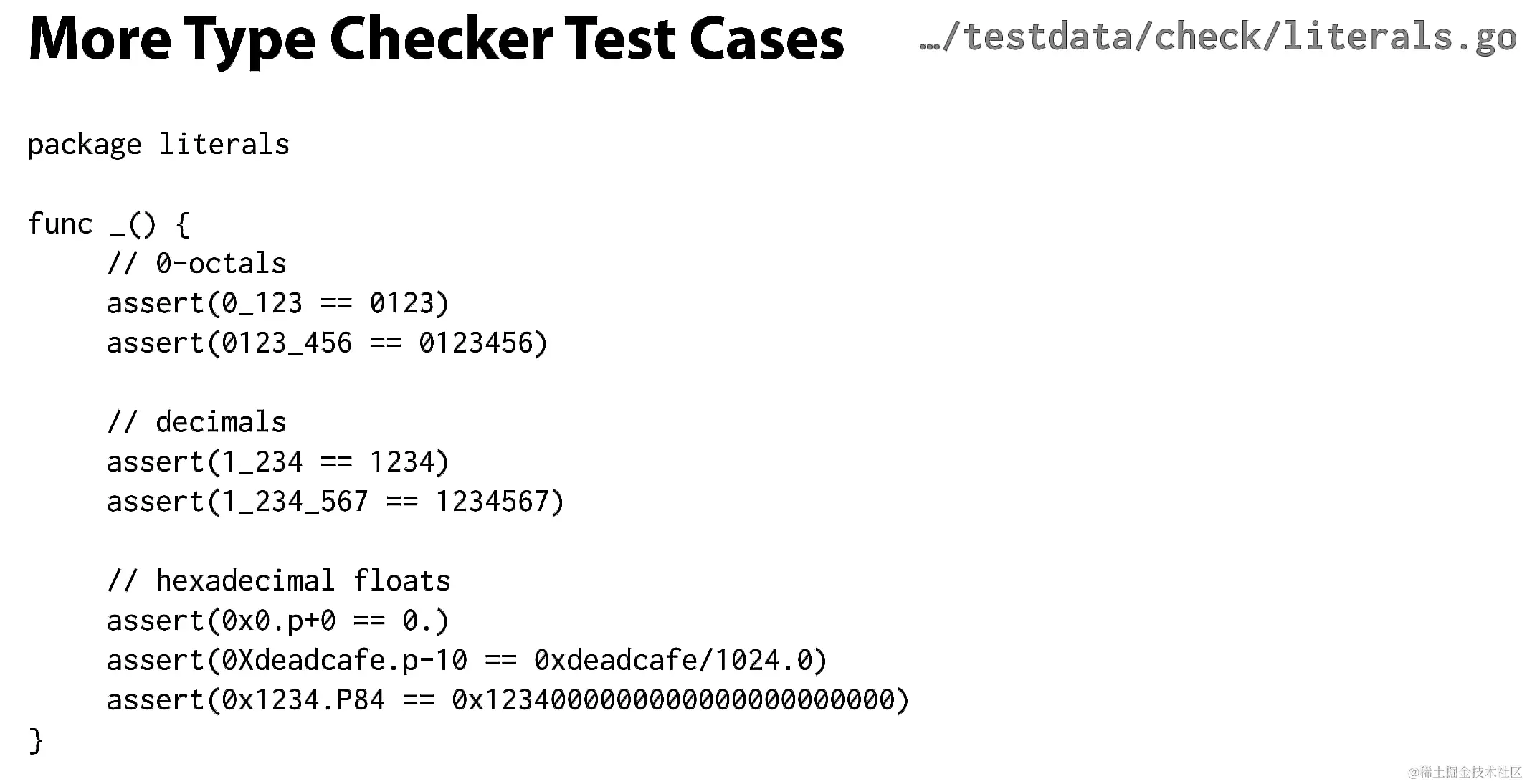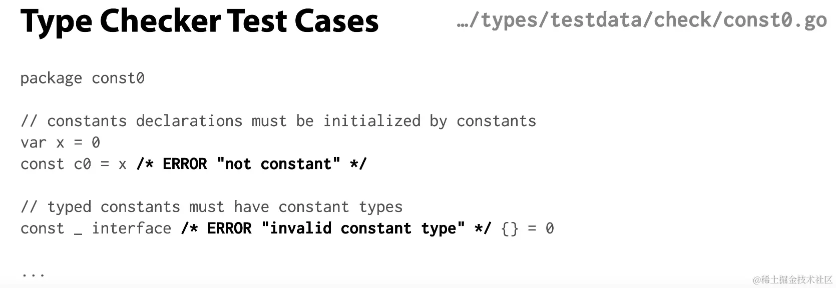 这是类型检查器的另一个例子。在此测试中,我们在通常的Go语法之上添加了一个assert注释。这使我们可以编写常量算术的测试,就像这个例子一样。类型检查器已经在计算每个常量表达式的布尔值,因此检查assert实际上只是检查常量是否已计算为true。