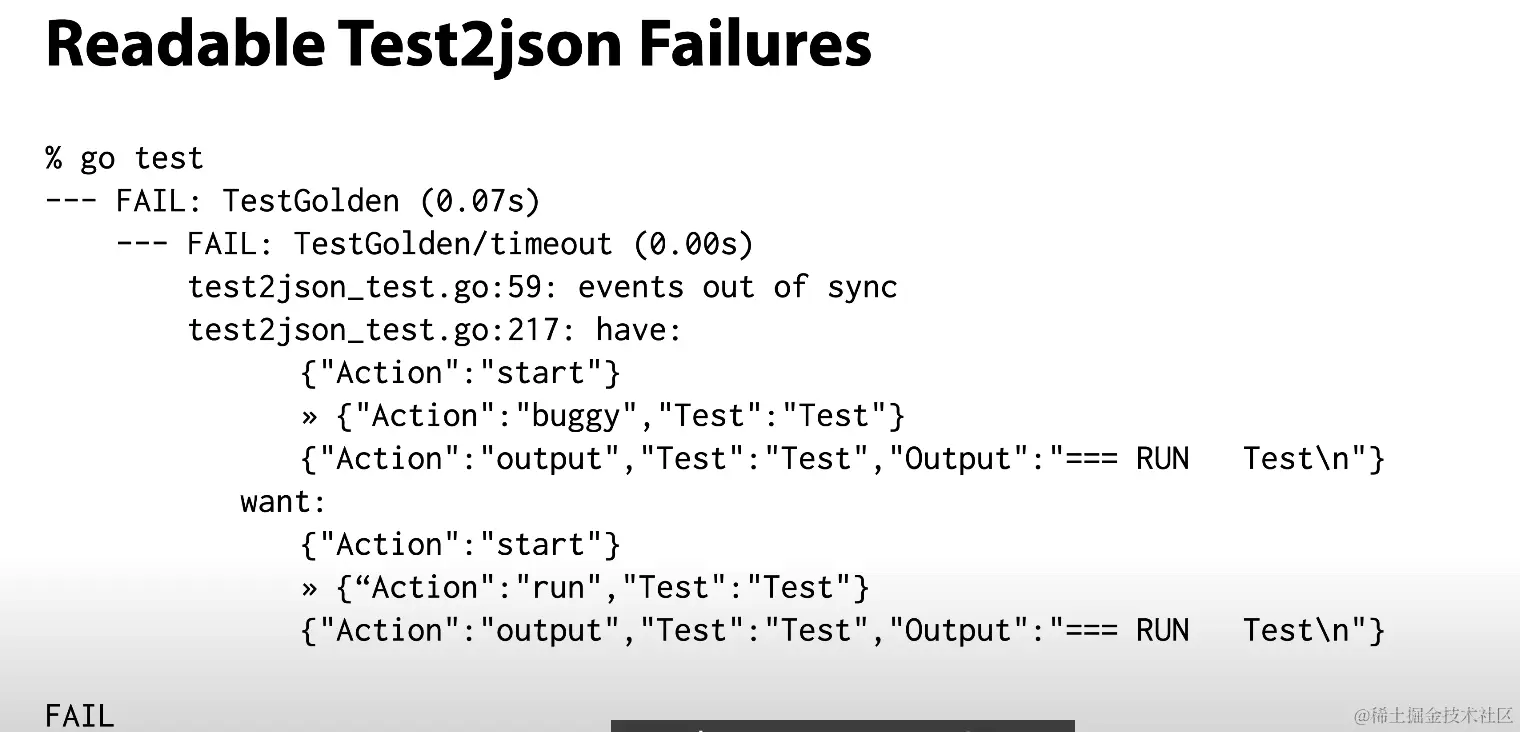 回到test2json,以下是其测试失败的原因。它会计算哪些事件不同并清晰地标记它们。