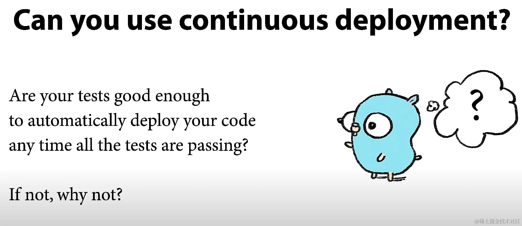 如果你的测试满足这一理想状态,就应该放心地将代码自动部署到生产环境中,只要你的测试全部通过, 这就是人们所说的“持续部署”(Continuous Deployment)。如果你还没有这样做,如果这个想法让你感到紧张,那么值得自问为什么。要么你的测试足够好,要么不够好。如果足够好,那为什么不这样做呢?如果不够好,那就倾听审视这些"没把握"..,并弄清楚哪些测试被遗漏了.