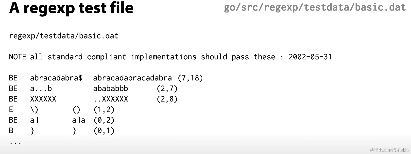 再举一个例子, Go正则表达式包 包含一些从AT&T POSIX正则表达式库复制的测试数据文件。我不会详细介绍,但很感激他们选择为该库使用文件驱动的测试,因为这意味着我可以为Go复用测试数据文件。这是另一种特别格式(ad-hoc),但它易于解析和编辑。
