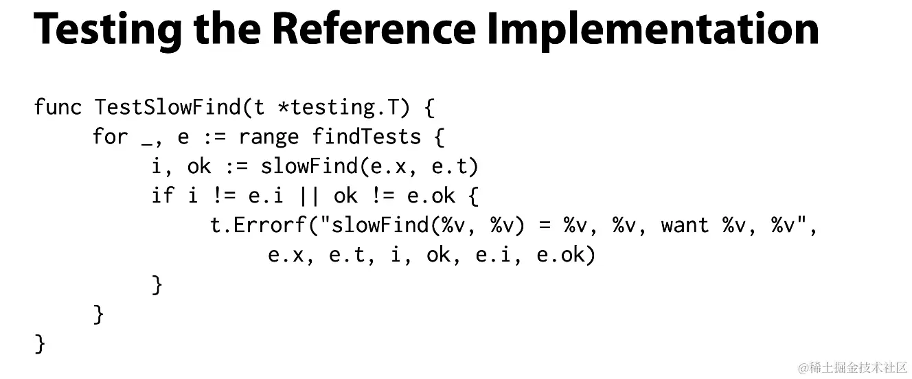 在本例中,参考实现被称为slowFind,该测试检查slowFind和find的答案是否一致,由于输入很小,slowFind可以是一个简单的线性搜索(译者评注: 即 暴力遍历)。