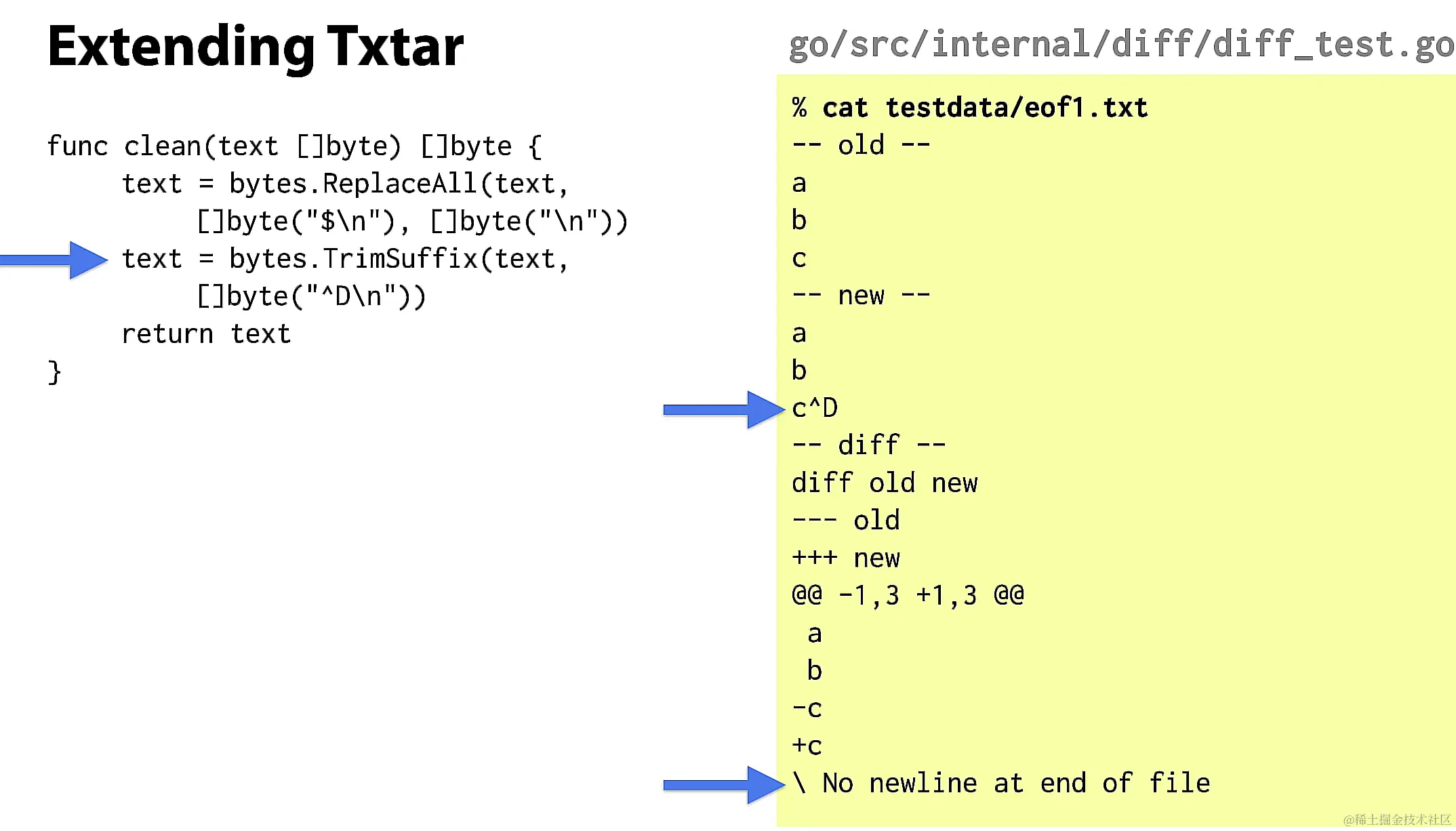 此外,txtar坚持文件中的每一行都以换行符结尾,但我们想在不以换行符结尾的文件上测试diff的行为。因此,测试允许末尾有字面上的^D。Clean会删除^D及其后面的换行符。在这种情况下,“新”文件最终没有最后的换行符,diff会正确报告该换行符。
