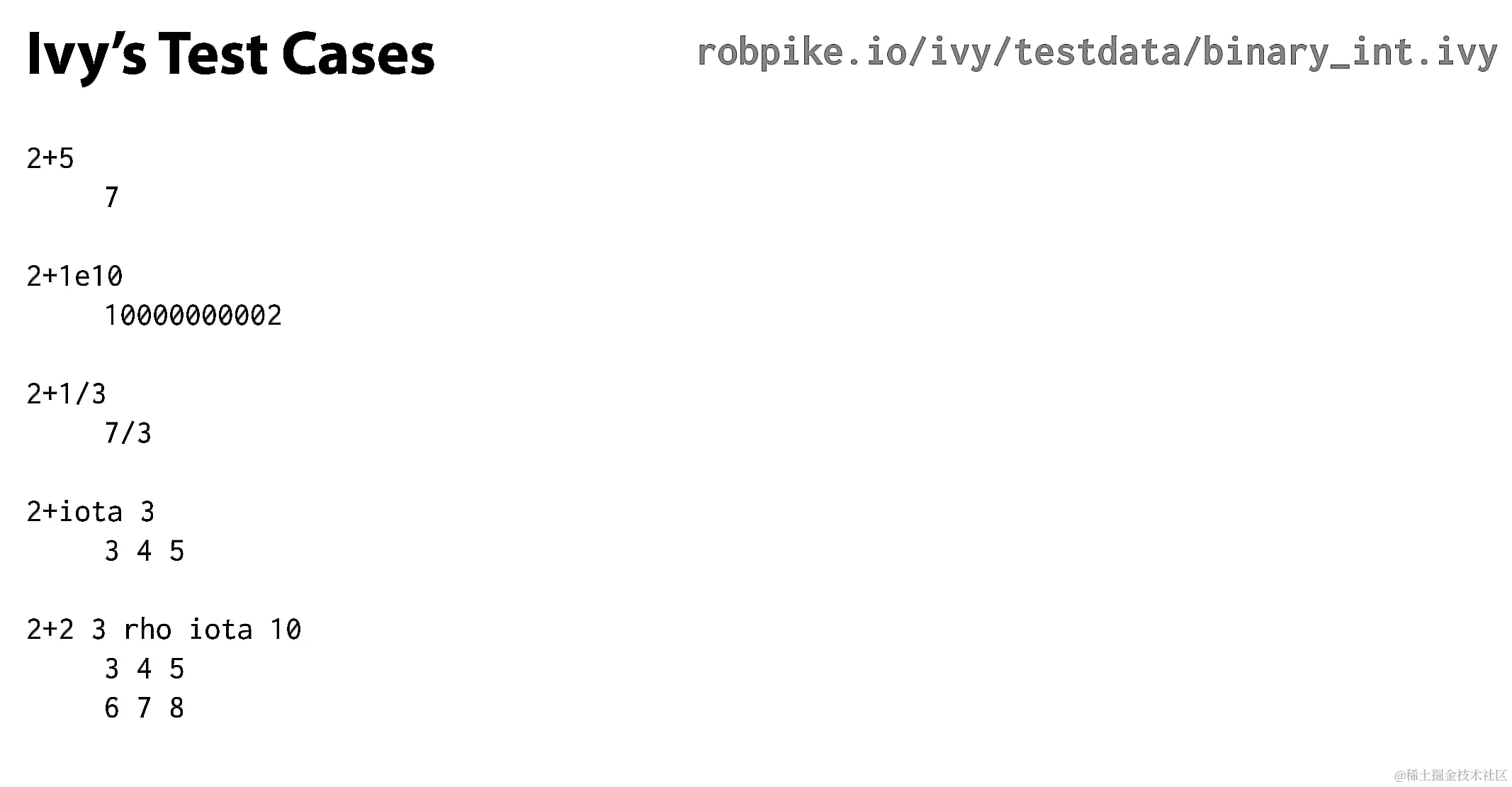 这里是另一个带注释的格式的例子。Ivy是一款交互式计算器。你输入程序(通常是简单的表达式),它会打印出答案。测试用例是这样的文件: