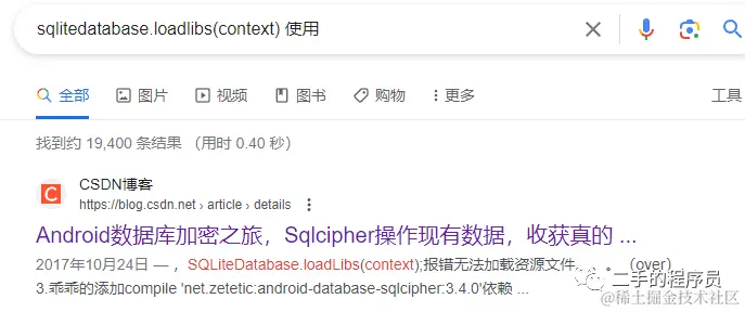 回想一下,我们解压出来的目录里面有一个 Encrypt.db,所以很明显,这里是要我们拿到这个加密数据库的密钥。看一下这个 sqlcipher 的用法,发现是在 getWritableDatabase 方法的时候传进去就行,那么就思路很简单了。