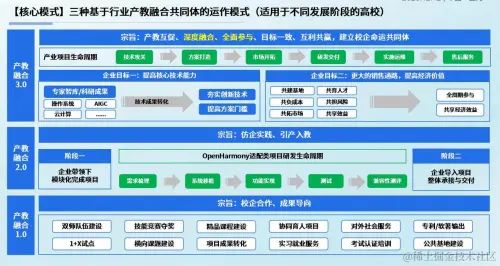 为推动形成同市场需求相适应、同产业结构相匹配的现代教育发展格局,刘太俊提出共同体基于行业产教融合运作模式,针对不同发展阶段的高校,规划设计了三阶段产教融合建设模式,即,1.0模式“校企合作、成果导向”,2.0模式“仿企实践、引产入教”,3.0模式“产教互促、深度融合(校企命运共同体达成)”。