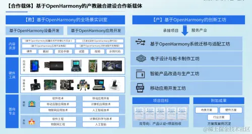 针对共同体建设落地的具体措施,刘太俊介绍了基于OpenHarmony的产教融合建设合作新载体,一面抓“教”,建设基于OpenHarmony的全场景实训室,另一方面抓“产”,建设基于OpenHarmoy的创新工坊。其中工坊包含基于OpenHarmony的系统迁移与适配工坊、电子设计与办卡制作工坊、智能产品改造与生产工坊、移动应用开发工坊。产教双载体的联合建设,将对促进产教融合进一步落地有重要的意义。润开鸿已基于校企合作共建载体逐步达成一系列教学与实训、产学合作、引产入教、共同服务产业等多元服务案例与课题落实。