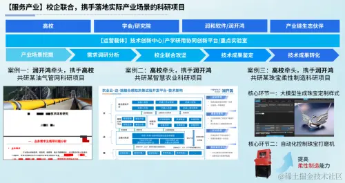 此外,刘太俊也与现场观众分享了润开鸿协调、整合产教各方资源,共同落地实际产业场景的科研项目案例,包括某油气管网科研项目、某智慧农业科研项目以及某珠宝柔性制造科研项目。