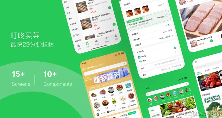 叮咚买菜是一款自营生鲜平台及提供配送服务的生活服务类APP,可以为电商设计师提供提供较好的参考和借鉴。整个例子包含了15个页面,覆盖了: 1)带有轮播的内容面板、弹窗; 2)底部标签页导航、左侧导航菜单; 3)视频详情页; 4)以及一套完整的下单、备注、支付流程; 该例子使用的组件有:内容面板、辅助画板、按钮、图标。 呈现的交互场景:滚动区、弹窗、内容切换、输入框等。