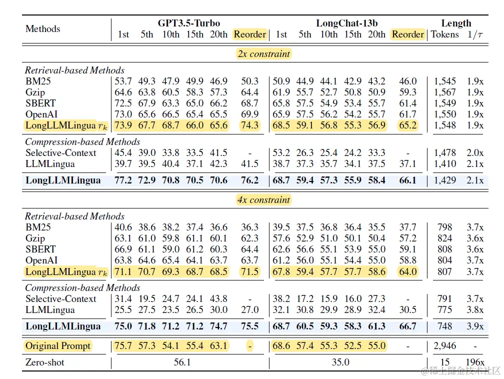 最后来一起看下效果,在LongLLMLingua中,论文对比了各种相似度排序方案保留TopN文档,并使用该排序方案进一步重排内容的效果。在2倍和4倍的压缩率下LongLLMLingua的效果都是显著最好的,不过可以发现只使用LongLLMLingua进行排序(Retrieval-base Methods)并做重排(Reorder列)的效果其实就已经不差了,而段落内部的token压缩更多是锦上添花。