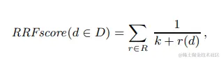 多路召回混合排序较常见的就是Reciprocal Rank Fusion(RRF),把所有打分维度都转化成排名,每个文档的最终得分是多路打分的排名之和的倒数。通过排名来解决不同打分之间scale的差异性。公式如下,其中r(d)是单一打分维度中的文档排名,K是常数起到平滑的作用,微软实验后给的取值是60。