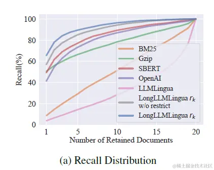 论文对比了不同打分排序方案,包括BM25,各种向量embedding,以及LLMLingua,其中LongLLMLinuga在TopK文档的召回率上显著更优,如下图。具体的压缩率和推理效果对比,我们放到后面的重排模块一起来说。