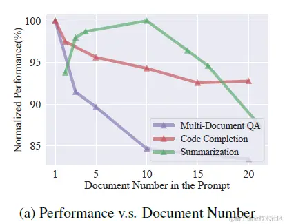 上一章提到使用query改写,多路索引,包括bm25离散索引,多种embedding连续索引进行多路内容召回。这种方案会提供更丰富的内容候选,但也显著增加了上文长度。而很多论文都评估过,过长的上文,以及过长上文中更大比例的噪声信息,都会影响模型推理的效果,如下图