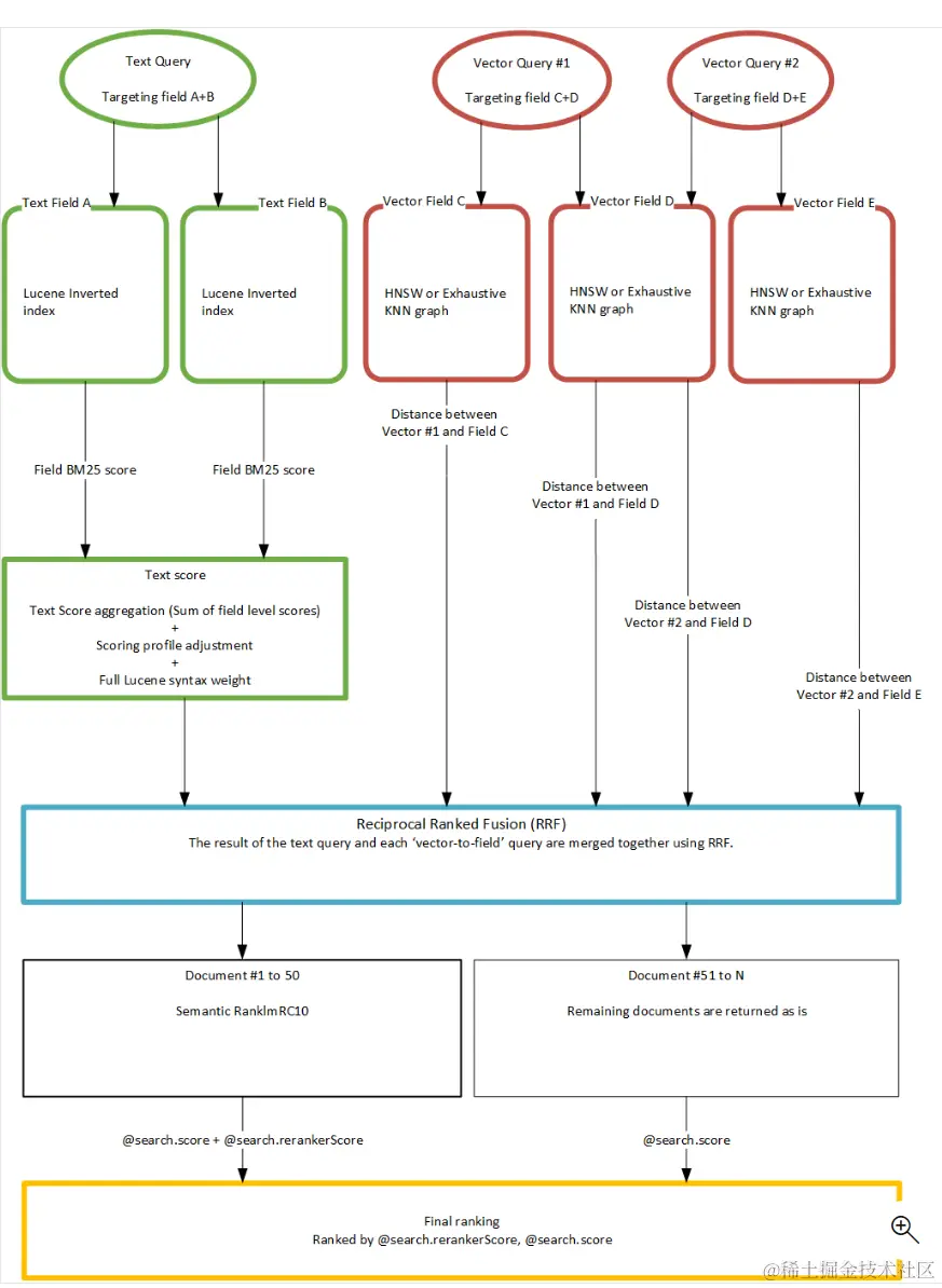 以下是微软搜索中使用RRF类合并文本检索和向量检索的一个示意图,使用RRF分别对文本检索和向量检索的多路召回内容进行混合排序