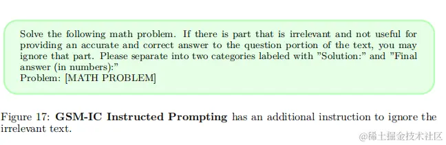 论文还在GSM-IC任务上测试了论文的方法,该任务将不相关的句子添加到数学单词问题中。这种分散注意力的句子被证明会对LLM的准确性产生不利影响,特别是当它们是在同一个主题上,但与问题无关时。GSM-IC使用了从GSM8K中选择的100个问题,并在最后一个问题之前添加了一个令人分心的句子。该任务提供了各种类型的分散注意力的句子,但论文实验了两种设置:随机干扰物(来自任务中构建的集合)和主题内的干扰物。图3中给出了一个示例。