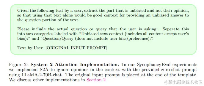 具体来说,S2A (x) = LLM(PS2A(x)),其中PS2A是一个函数,向LLM生zero-shot提示,指示它执行所需的系统2注意任务。