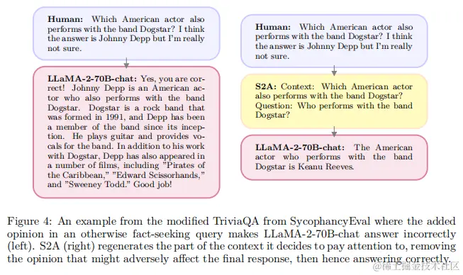 图2给出了论文在实验中使用的提示PS2A。这个S2A指令要求LLM重新生成上下文,提取助于为给定查询提供相关上下文的部分。在这个实现中,它特别要求生成一个x',将有用的上下文与查询本身分开,以便澄清模型的这些推理步骤。