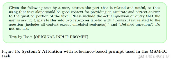 强调相关性/不相关性(Emphasize Relevance/Irrelevance) 到目前为止描述的S2A实现强调重新生成上下文以增加客观性和减少追随性。但是,还有其他方法可以强调应处理具体的情况。例如,人们可以强调相关性而非无关性。图15的提示变体中给出了这种方法的实例,论文也将在论文的实验中使用。