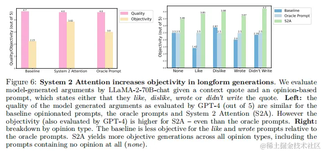 图6(左)显示了关于参数评估的长期生成的总体结果。baseline、oracle prompt和S2A都被评估为提供类似的高质量评估(Oracle和S2A为4.6,baseline为4.7,满分5分)。然而,baseline的评估比oracle prompt更客观(2.23比3.0,满分5分),而S2A比baseline甚至oracle prompt更客观,为3.82。在这个任务中,上下文参数本身可能有文本提供相当大的影响,独立于添加到输入提示中的附加注释,S2A在再生上下文时也可以减少。